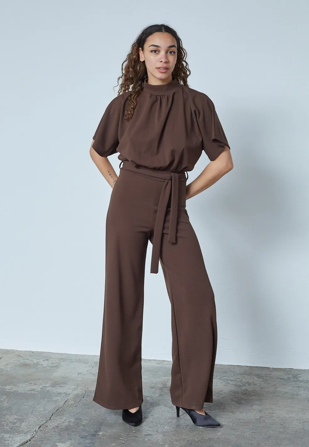 Jumpsuit fra Sisters Point i mørkebrun farve. Lavet af en blanding af polyester og elastan med en løs pasform og ankel-længde.
