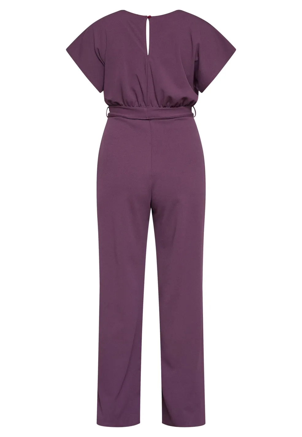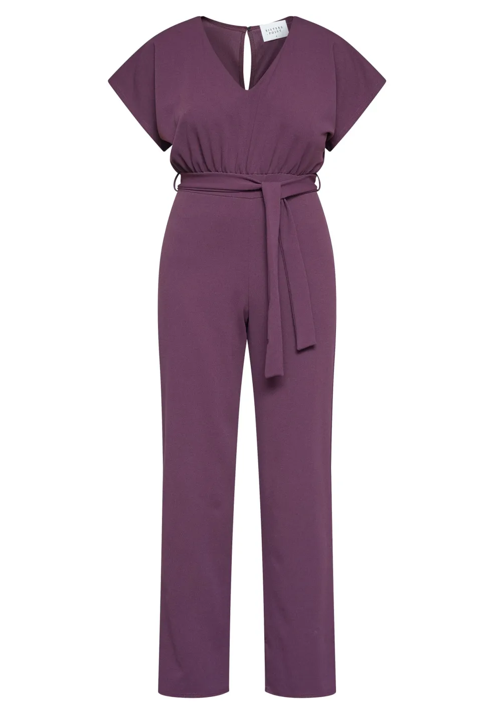 Buksedragt fra Sisters Point i dyb bordeaux. Buksedragten har brede ben, korte ærmer og V-hals med åben slids bagpå.