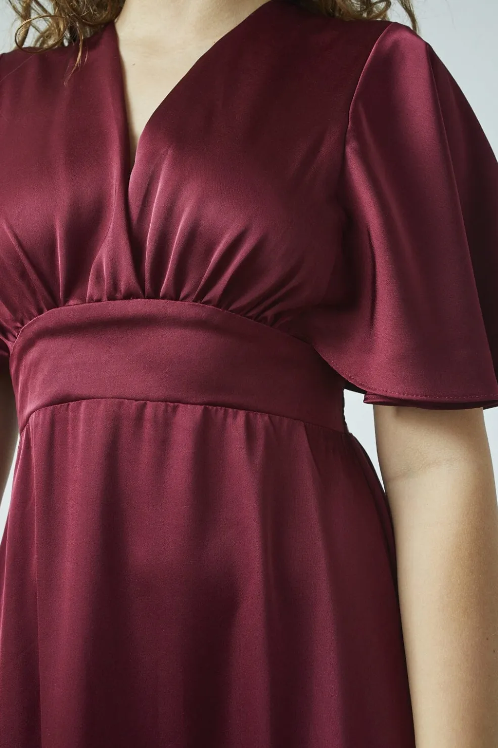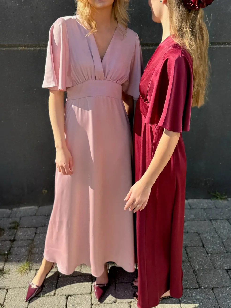 Bordeauxfarvet festkjole fra Sisters Point med v-udskæring og korte, brede ærmer. Den lange kjole har smock-detaljer på ryggen og en løs pasform.