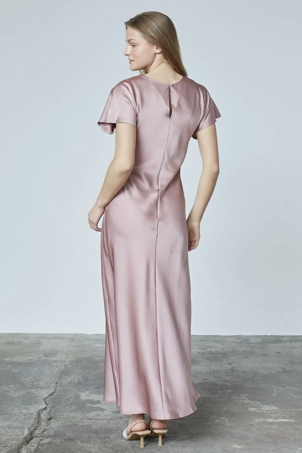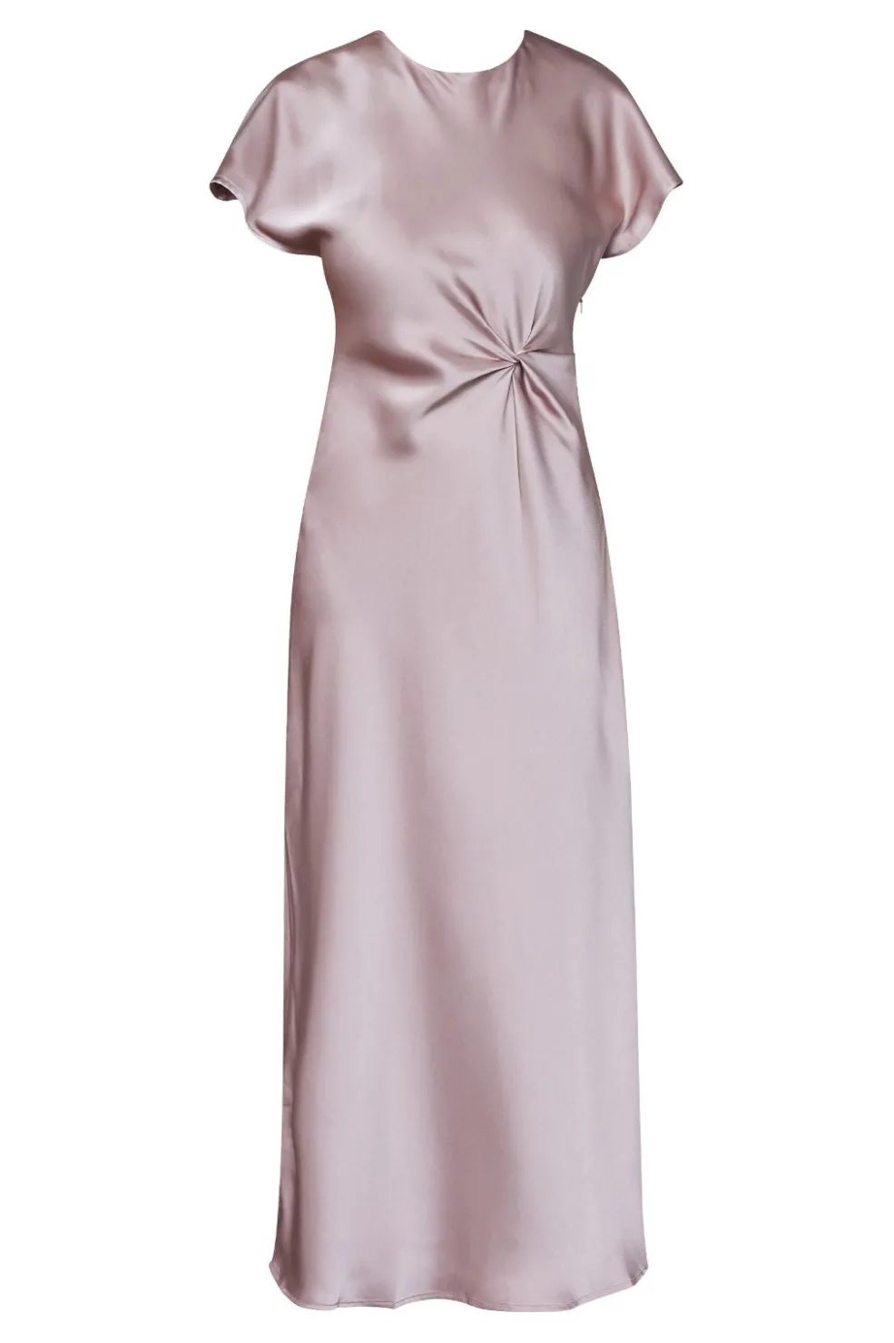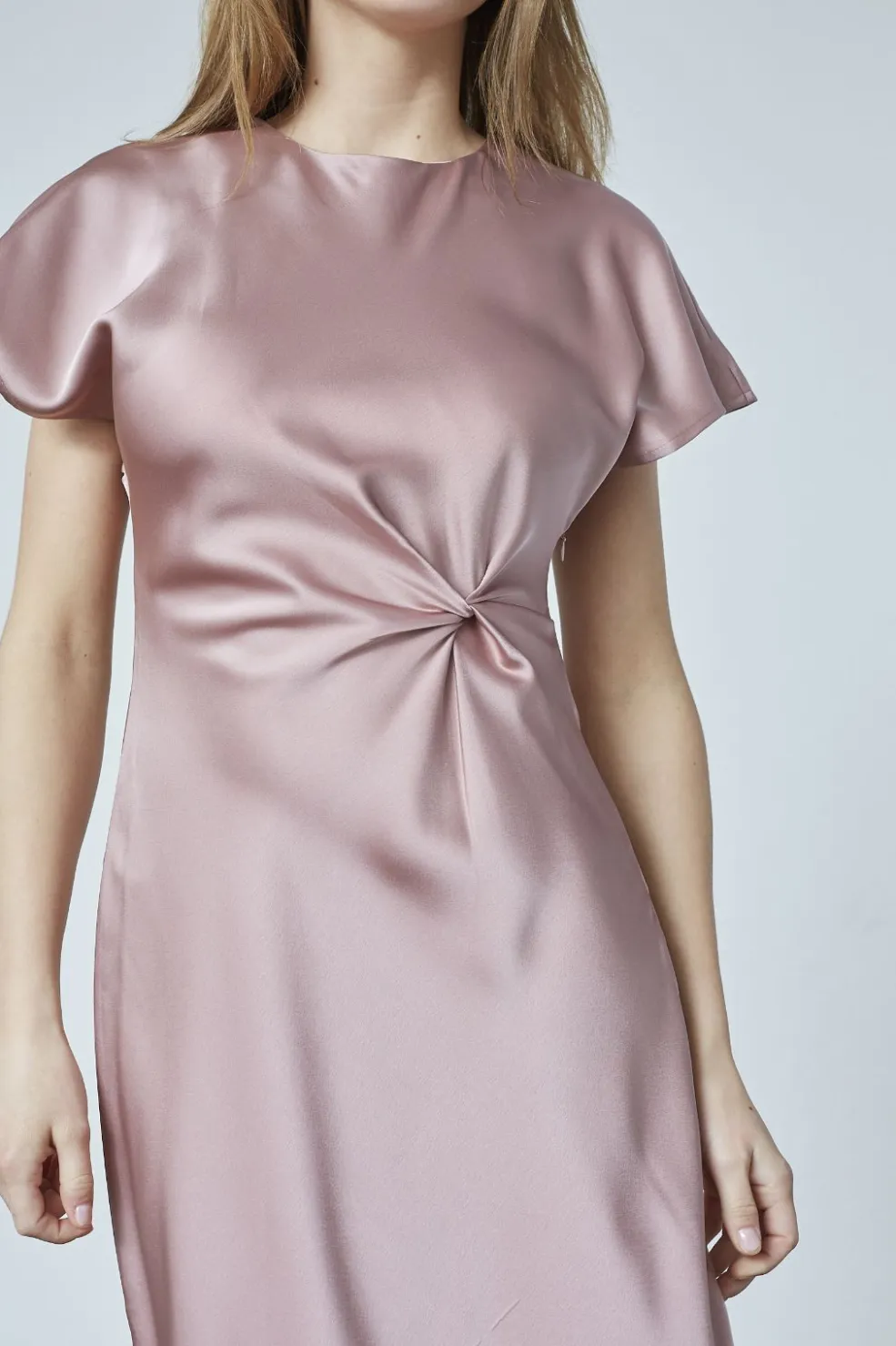 Lang kjole fra Sisters Point i lyserosa. Kjolen har korte ærmer, rund halsudskæring og en twist-detalje ved taljen. Knapperne bagpå gør den nem at tage af og på.