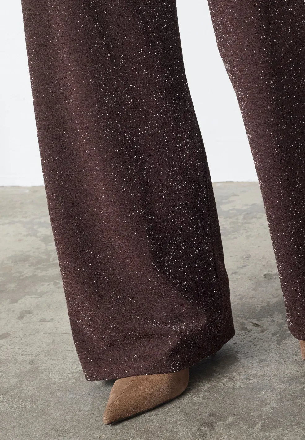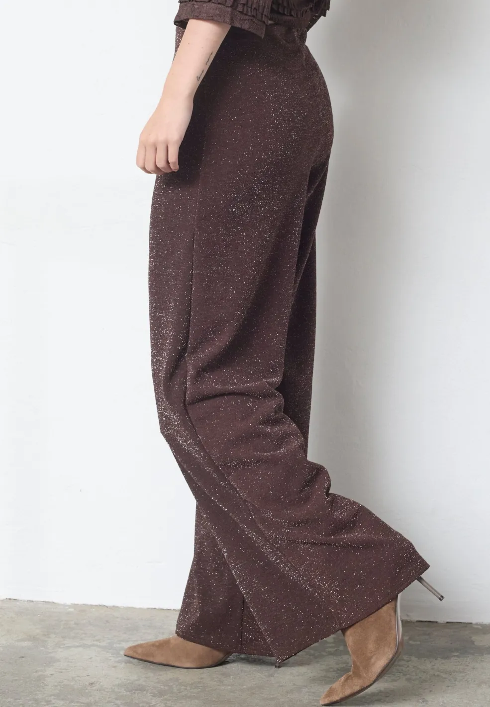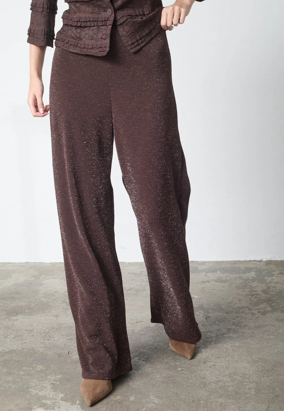 Bukser fra Sisters Point i chokoladebrun med sølvglimmer. Bukserne har brede ben og en løs pasform, der er passende til festlige og formelle lejligheder.