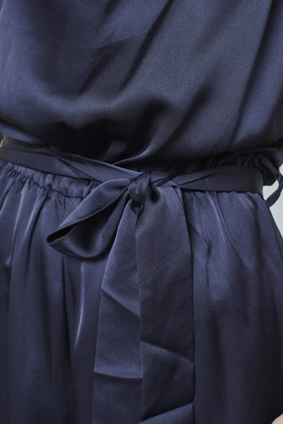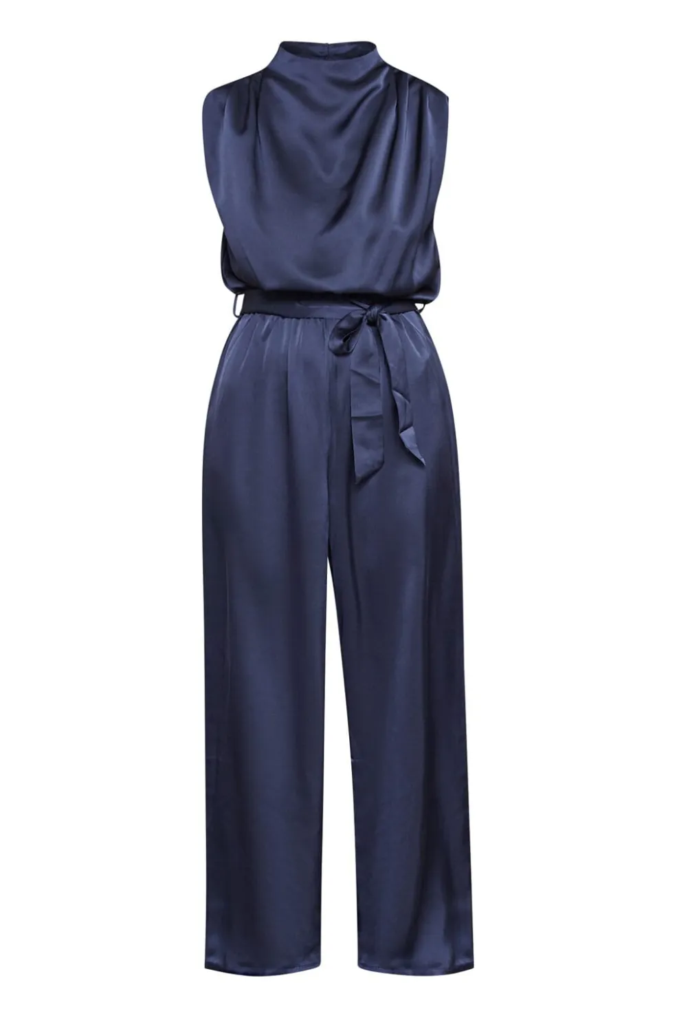 Mørkeblå jumpsuit fra Sisters Point i satin med høj hals. Den har en løs pasform og gulvlængde med et bindebånd i taljen, der kan justeres efter ønske.