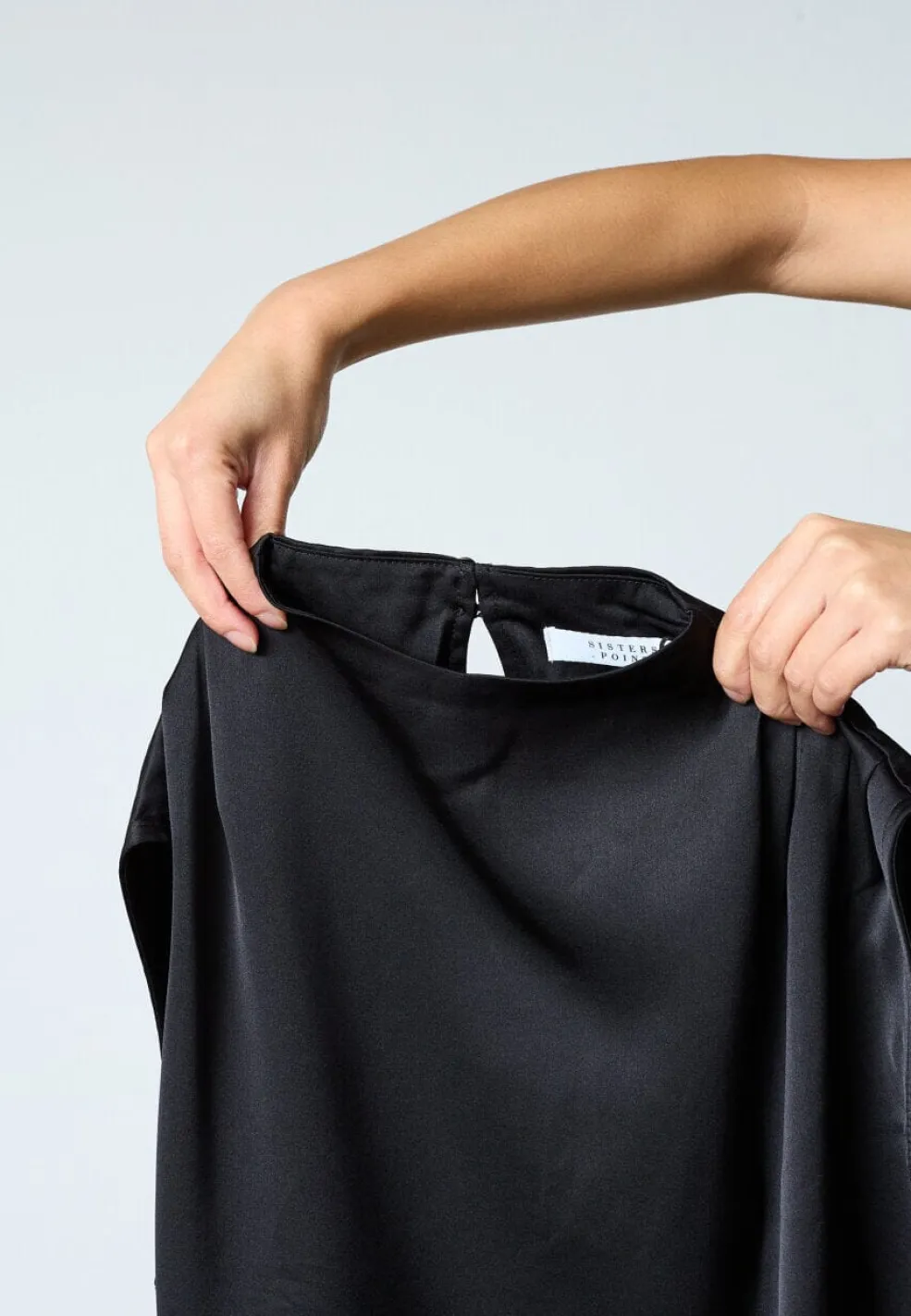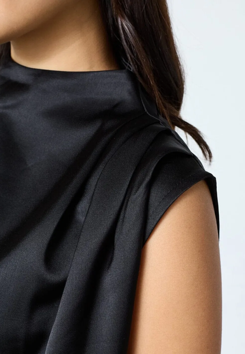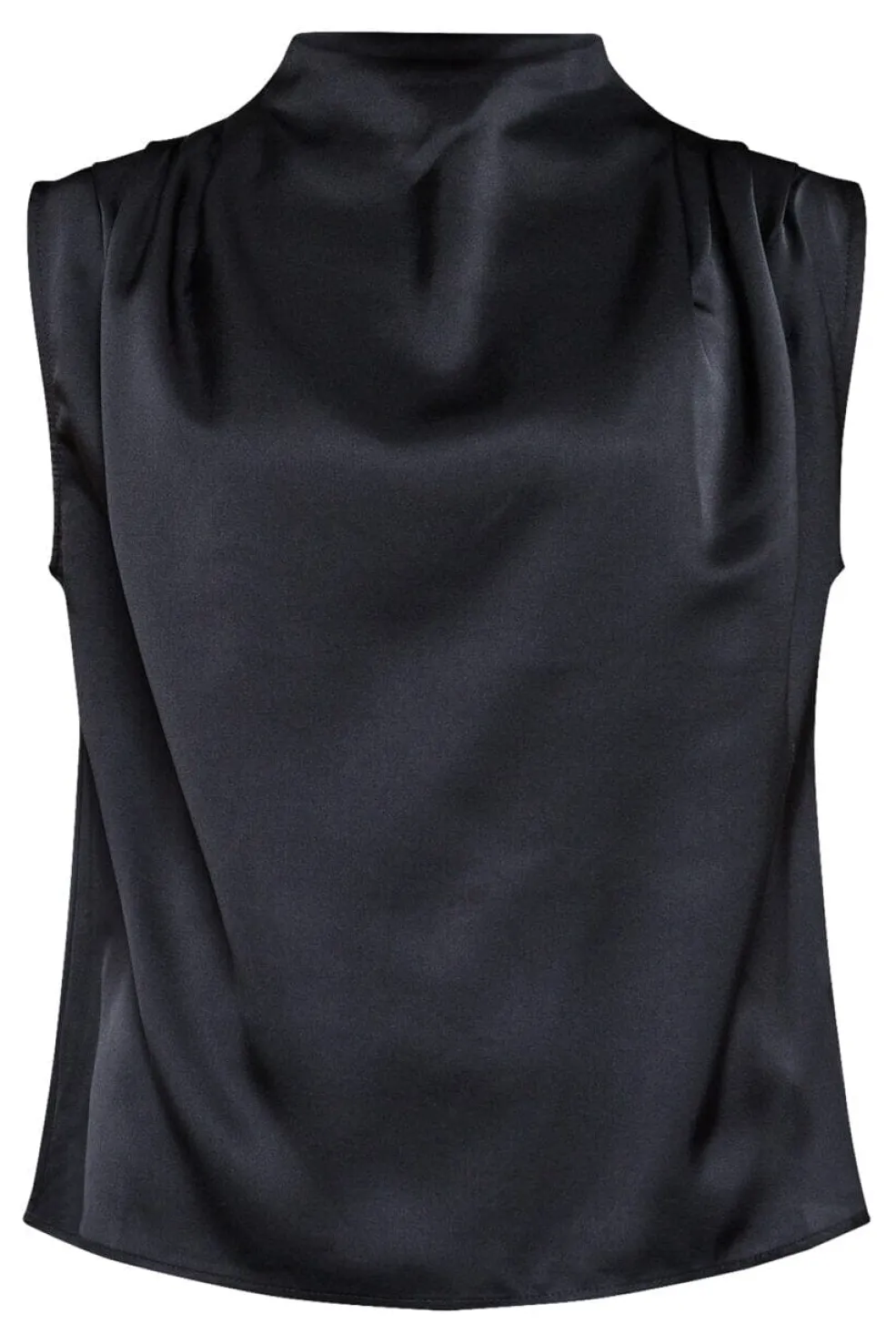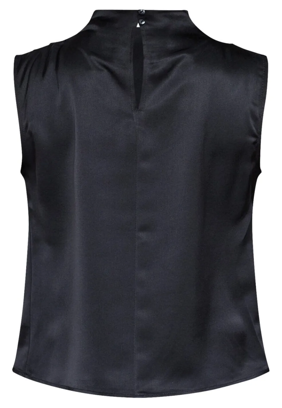 Sort ærmeløs bluse fra Sisters Point med et skinnende satinlook. Materialet er 100% polyester med en glat overflade.