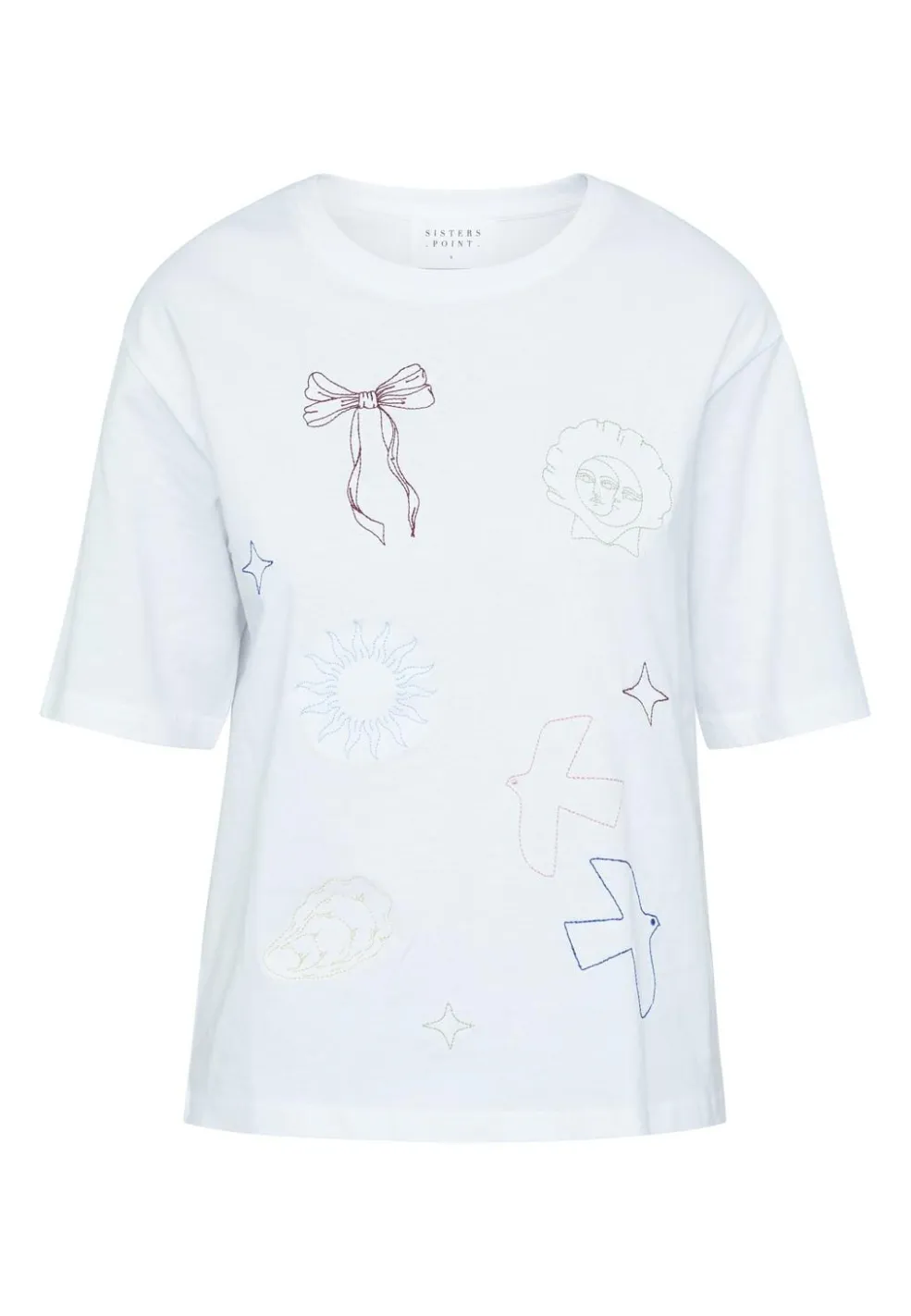 Hvid t-shirt fra Sisters Point med broderede motiver i flere farver. T-shirten har en løs pasform med korte ærmer og rund hals.