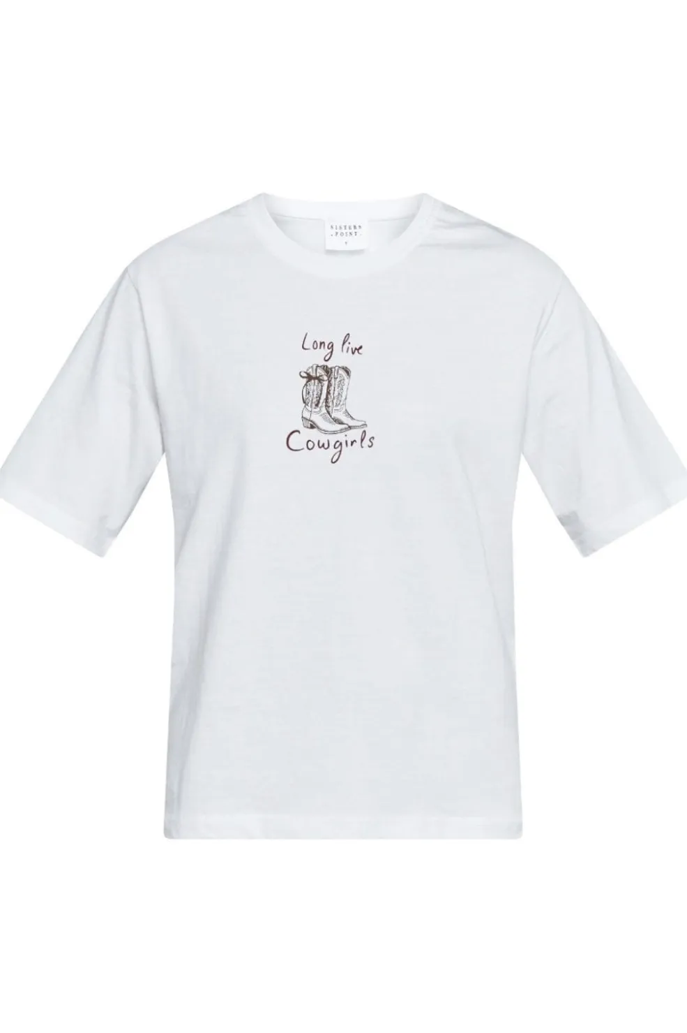 Hvid t-shirt fra Sisters Point med mocha-farvet print. T-shirten har en løs pasform og et western-inspireret design med cowboystøvler og tekst på forsiden.