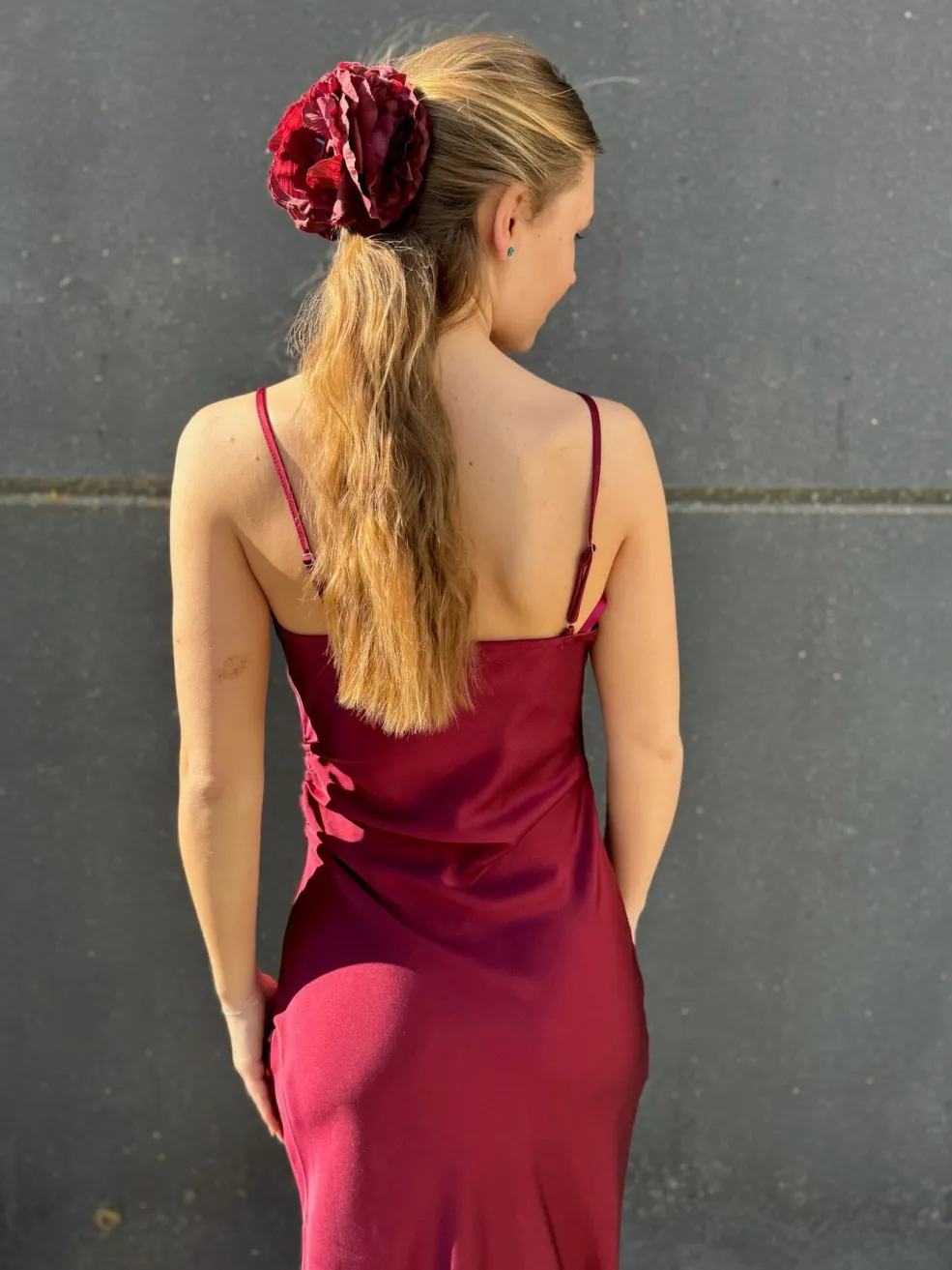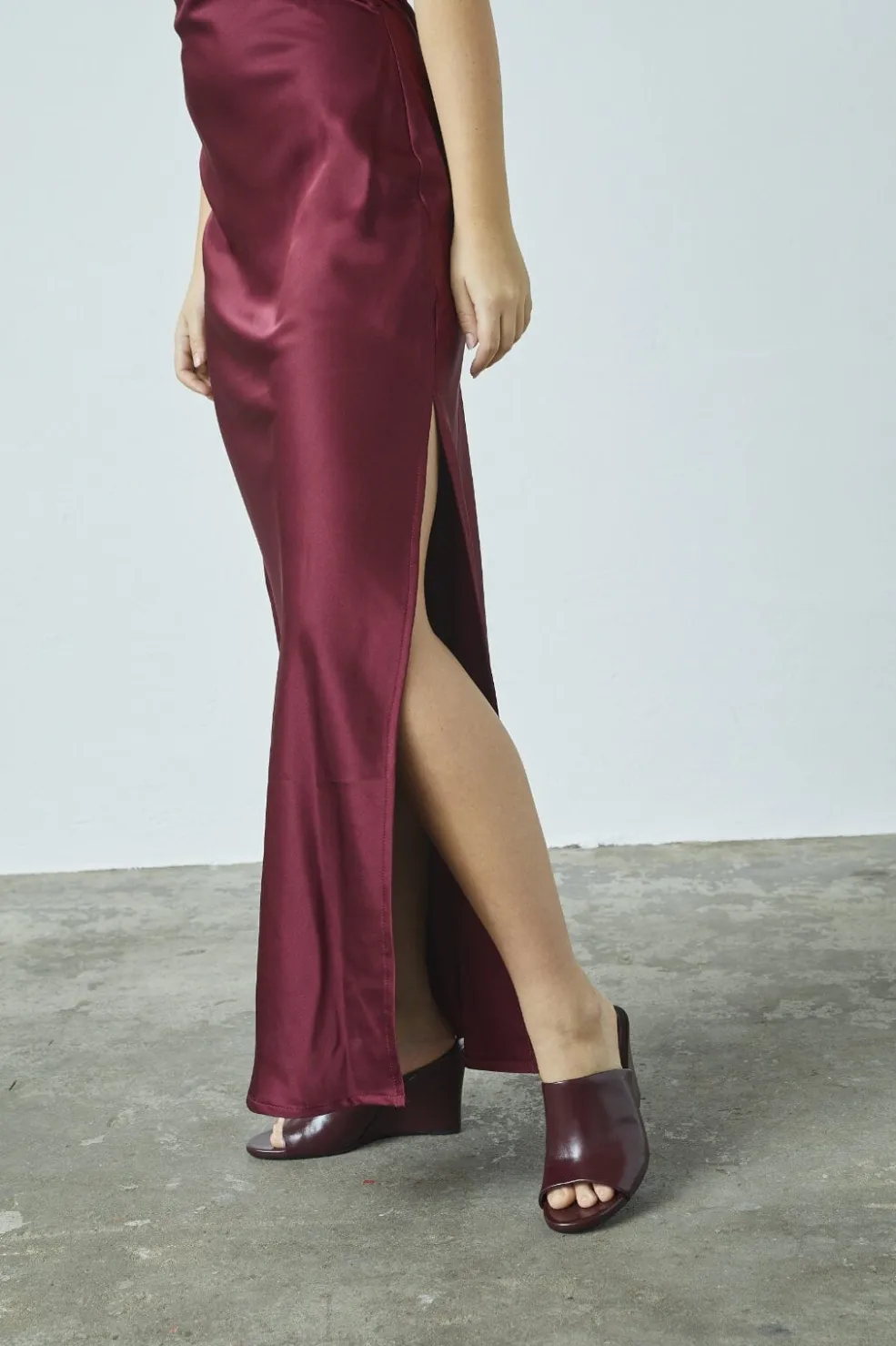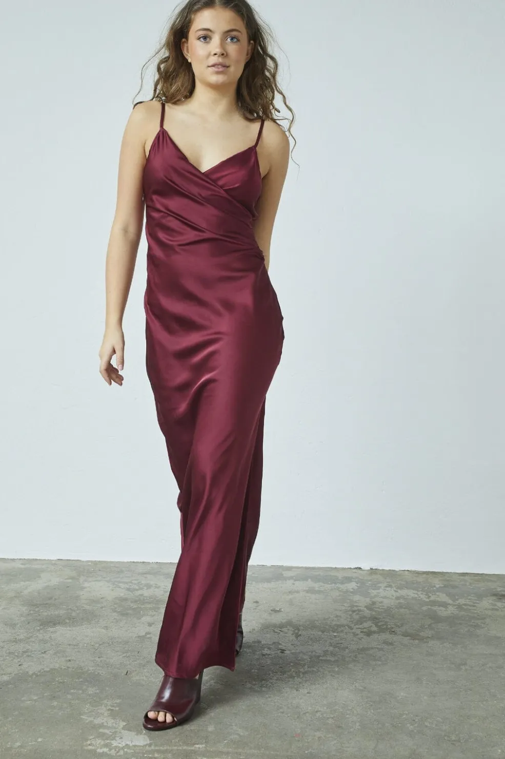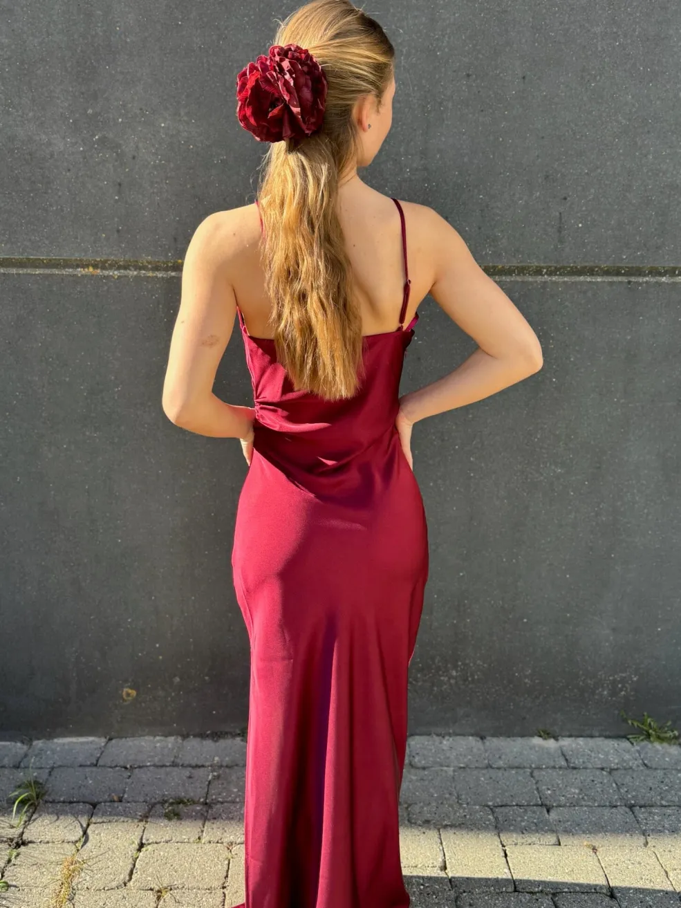 Lang burgunderrød kjole fra Sisters Point med satinlignende overflade. Kjolen har tynde, justerbare stropper, v-udskæring og en slids i siden.