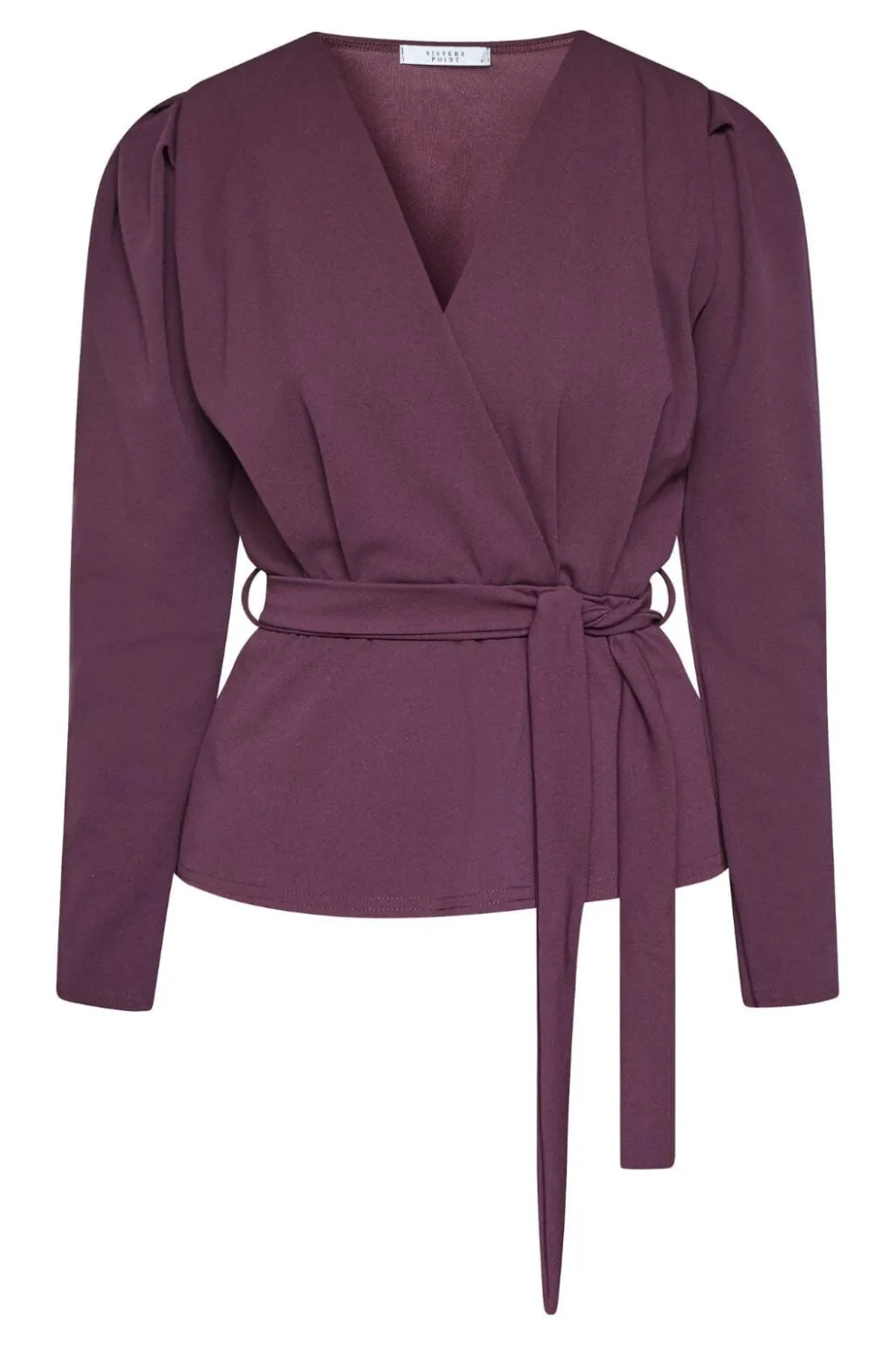 Bluse fra Sisters Point i dyb bordeauxfarve. Blusen har en v-hals og lange ærmer med rynkede detaljer ved skuldrene.