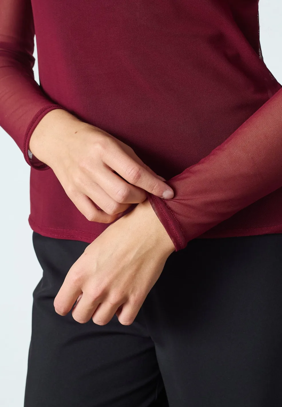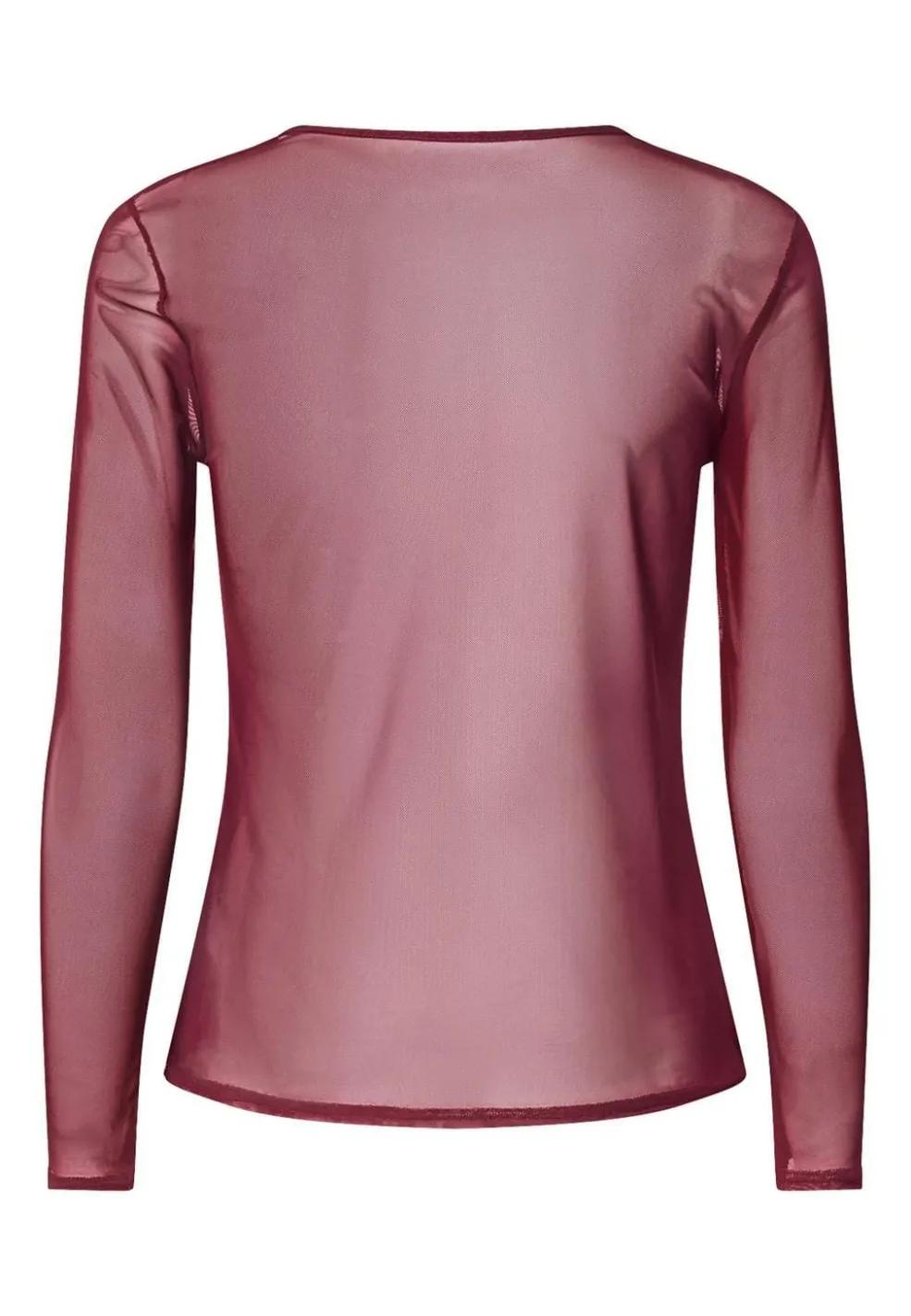 En bordeauxfarvet bluse fra Sisters Point, lavet af transparent mesh. Blusen har lange ærmer og en bådformet halsudskæring med slim fit.