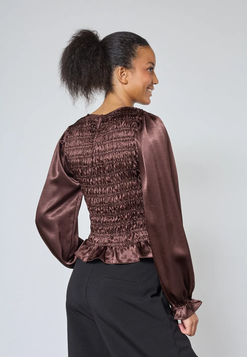 Brun bluse fra Sisters Point, lavet af satinmateriale. Blusen har rund halsudskæring, lange ærmer med let puffet effekt og tæt smock over brystet og ryggen.