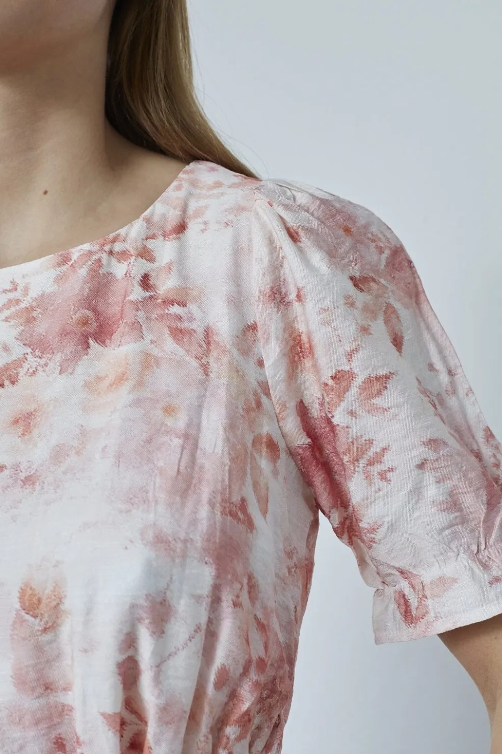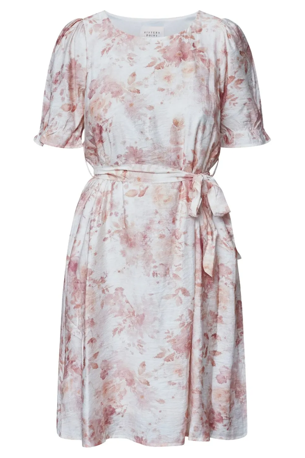 Knælang kjole fra Sisters Point i hvid med lyse koralblomster. Kjolen har puffede ærmer og rund halsudskæring samt et bindebånd i taljen, der kan justeres.