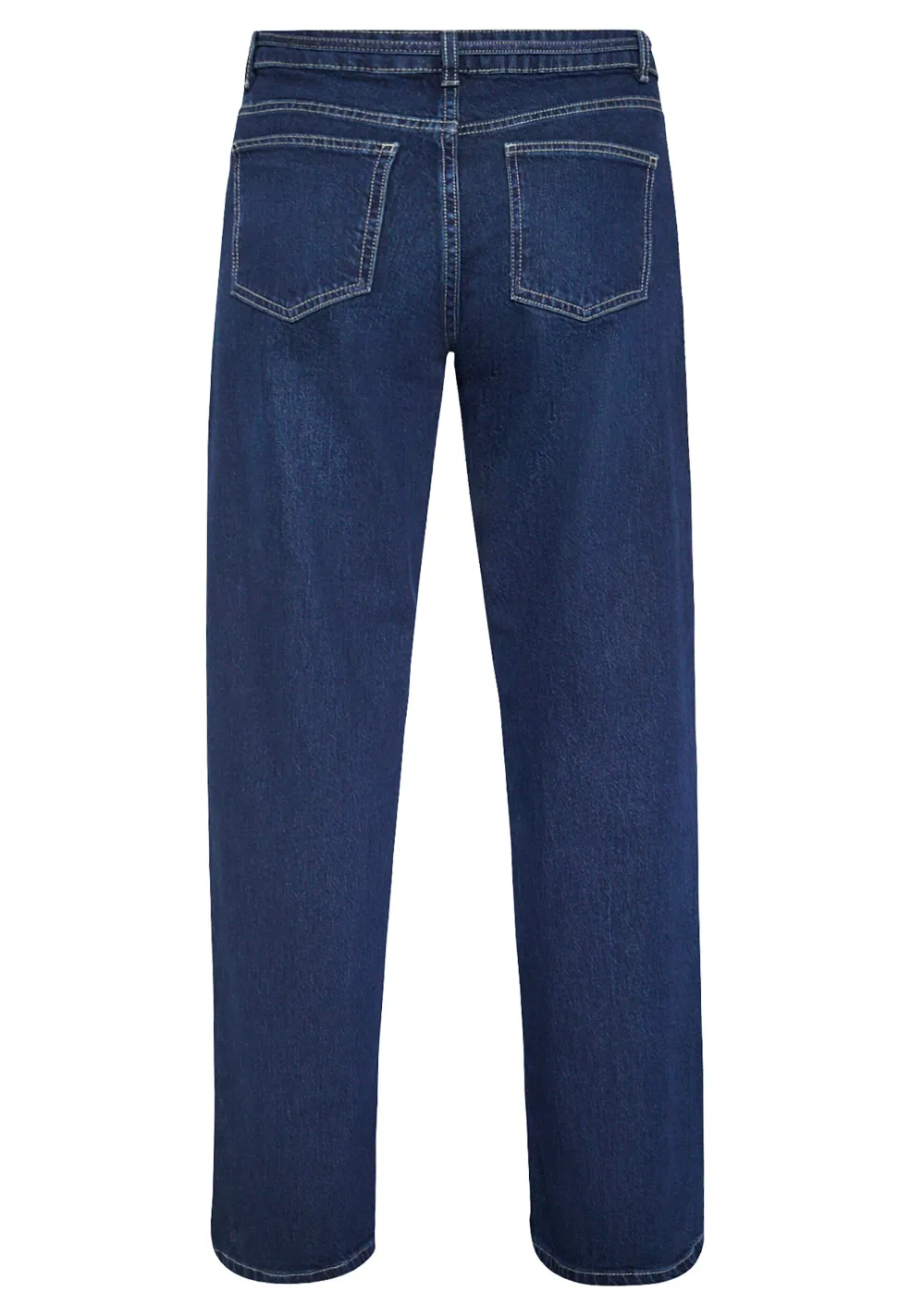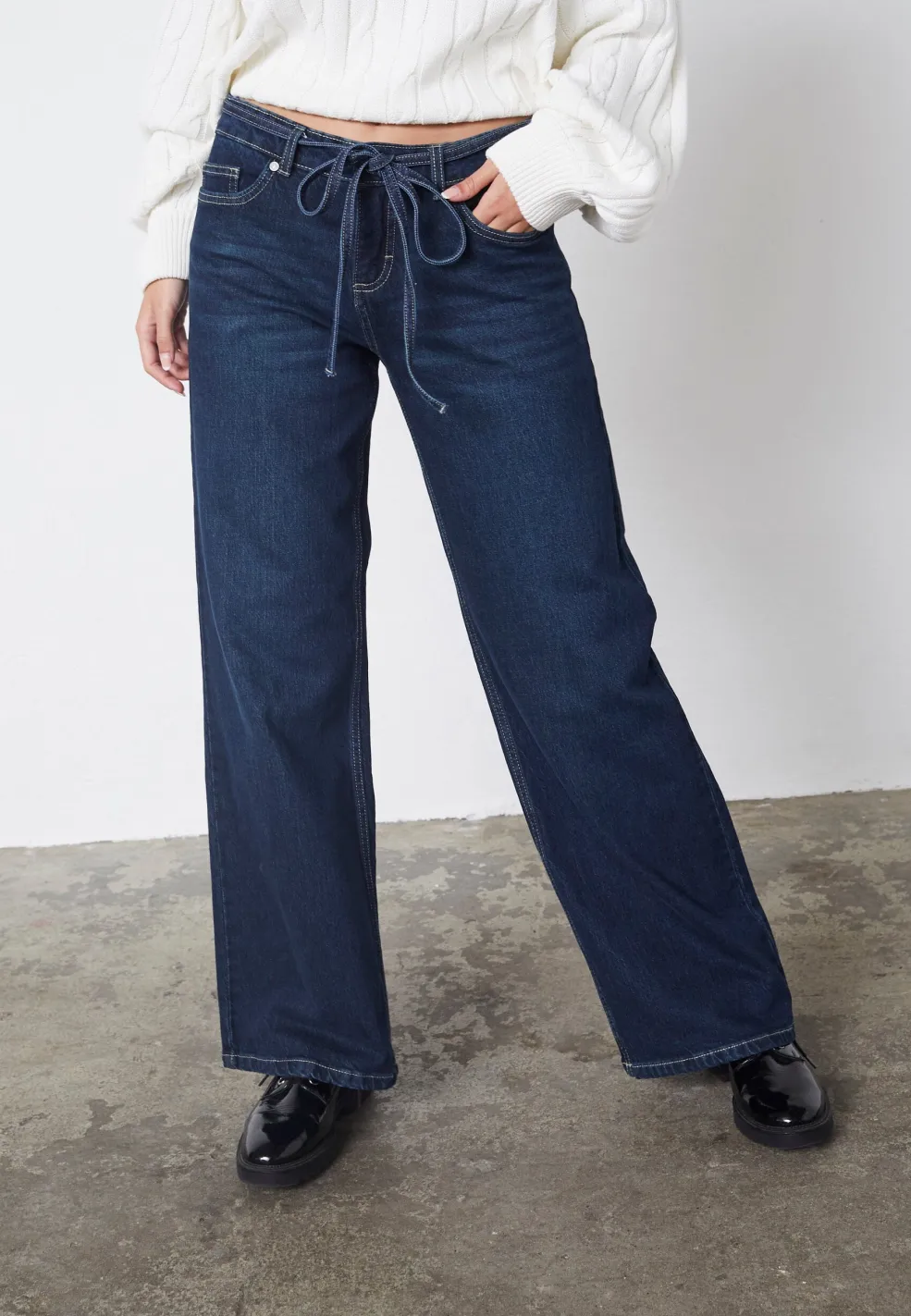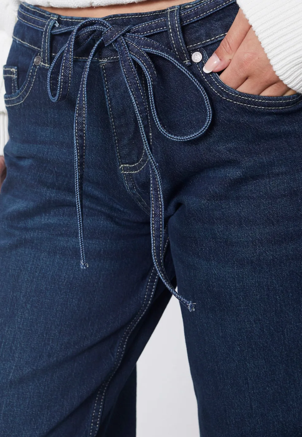 Mørkeblå jeans fra Sisters Point med en løs pasform. Jeansene har bindebånd i taljen og er lavet i en mørkeblå vask.