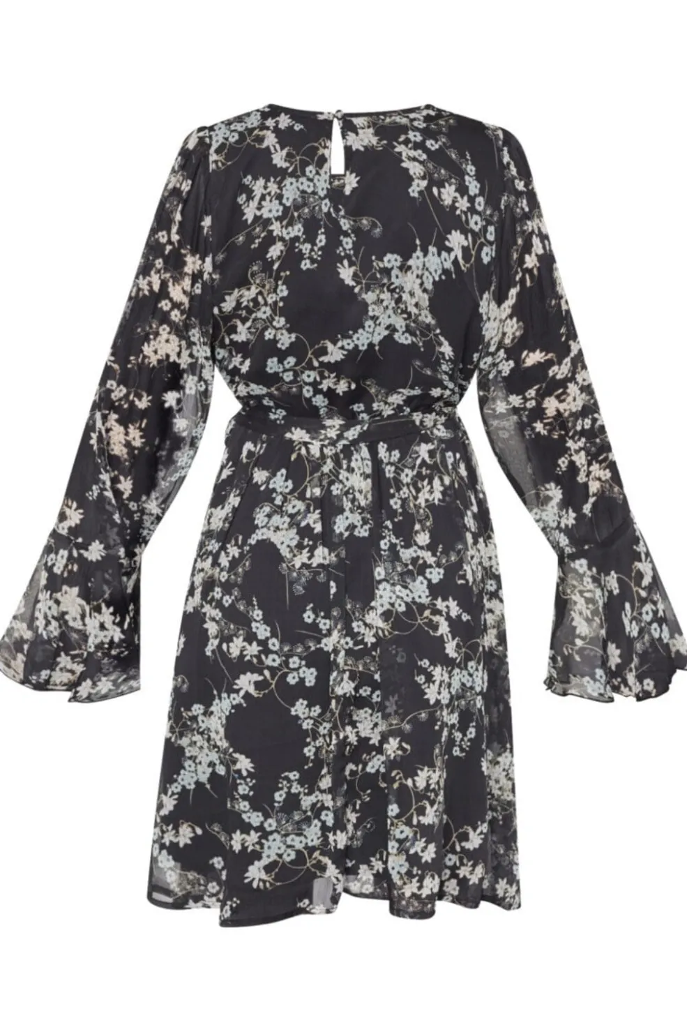 Sort kjole fra Sisters Point med blomsterprint i lyse farver. Kjolen er knælang med lange, transparente ærmer.