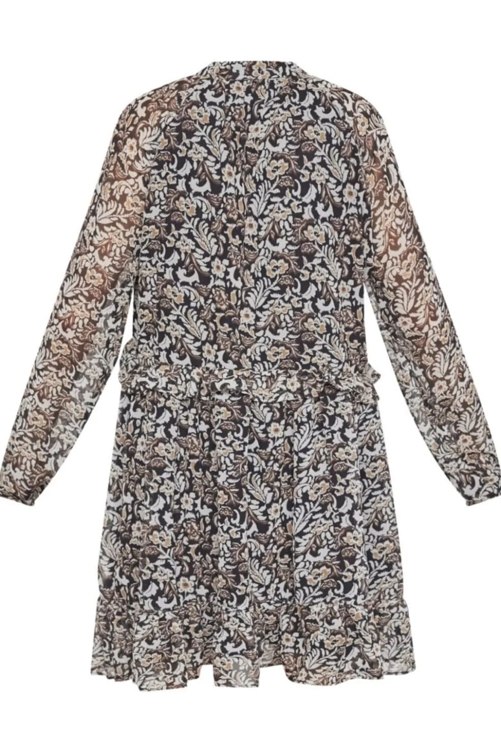 Sort kjole fra Sisters Point med paisleymønster. Kjolen har V-udskæring, lange transparente ærmer og flæsedetaljer ved halsen og forneden.