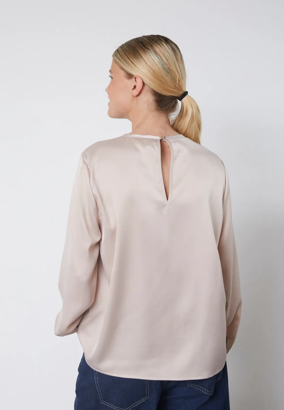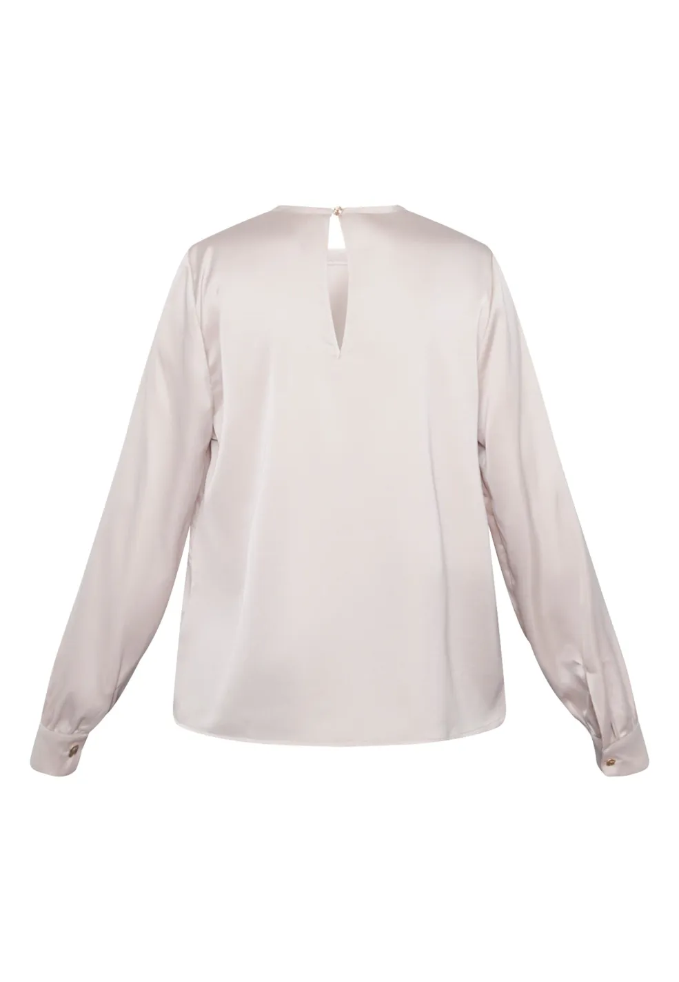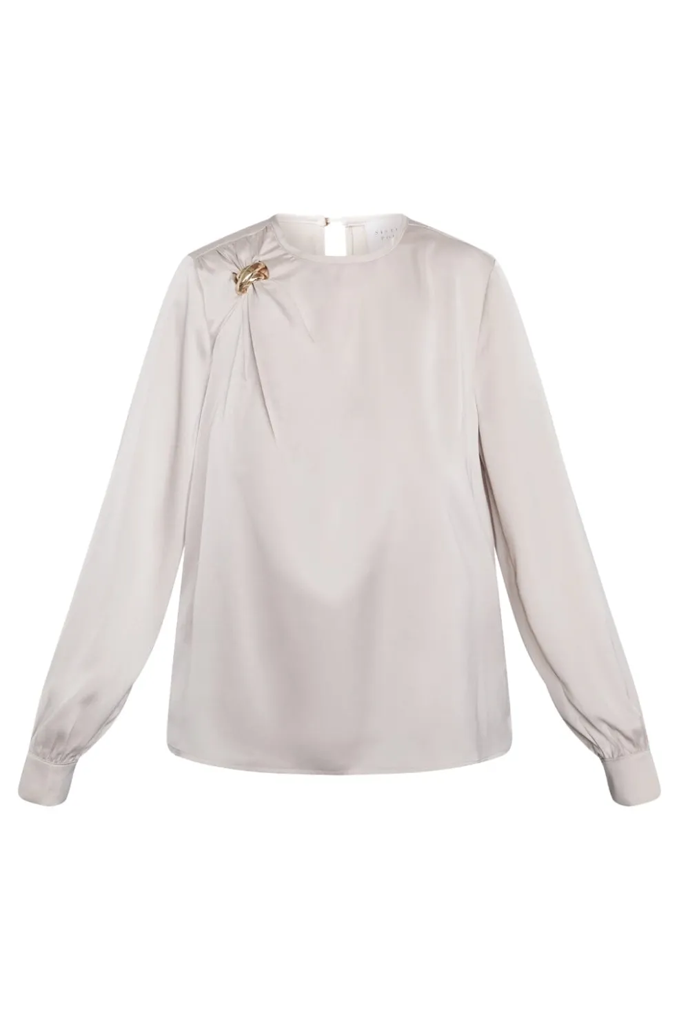 En lys cremefarvet bluse fra Sisters Point med lange ærmer og et guldfarvet metalspænde på skulderen.