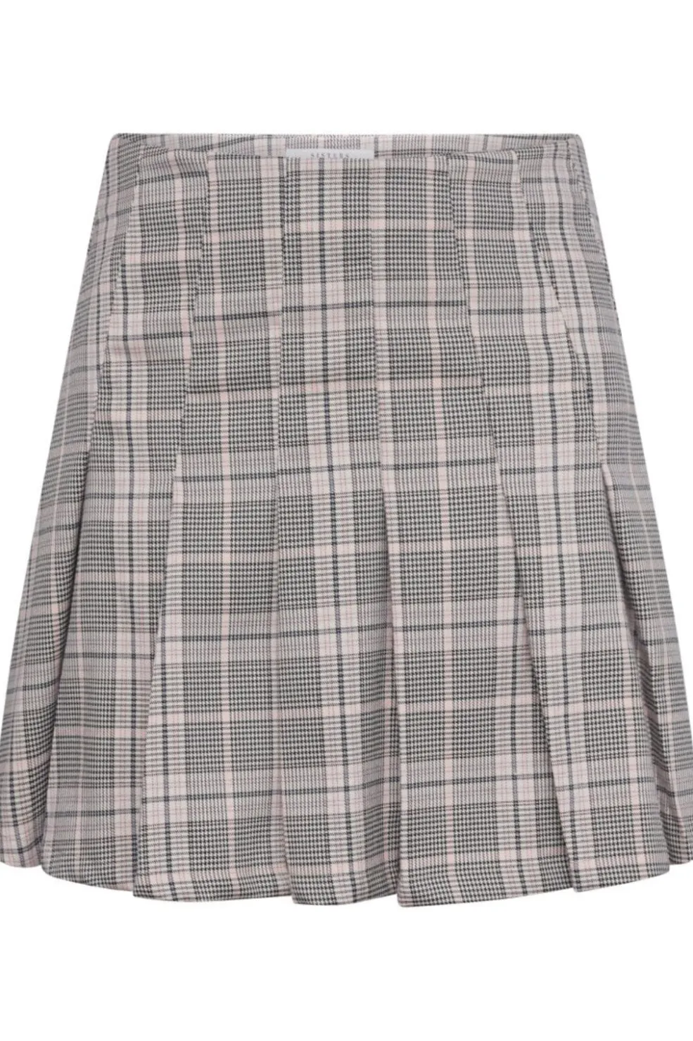 Ternet nederdel fra Sisters Point med plisseret design i lårlængde. Den høje talje og det ternede mønster i grå, pink og grønne nuancer giver nederdelen et blødt og feminint udtryk.