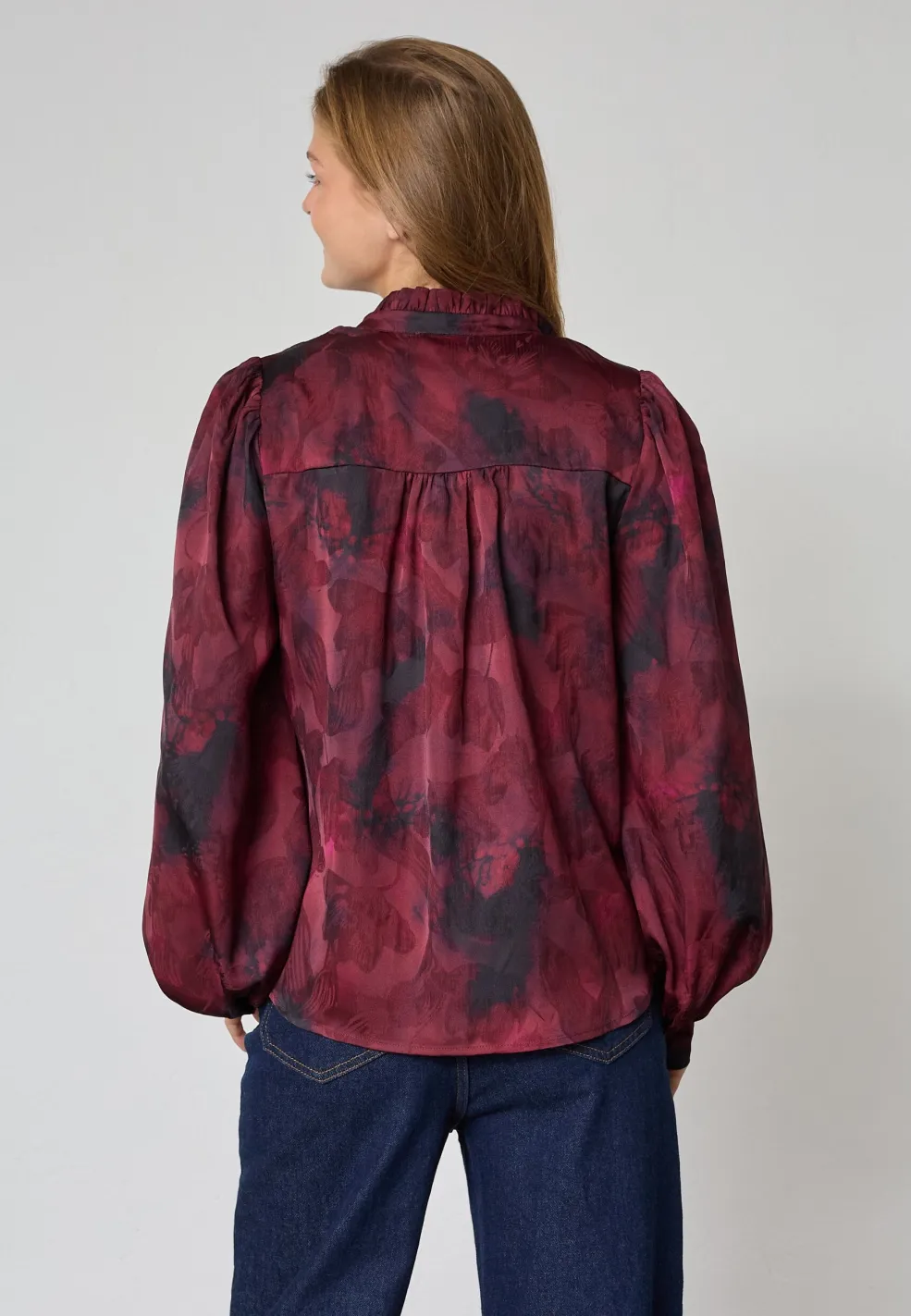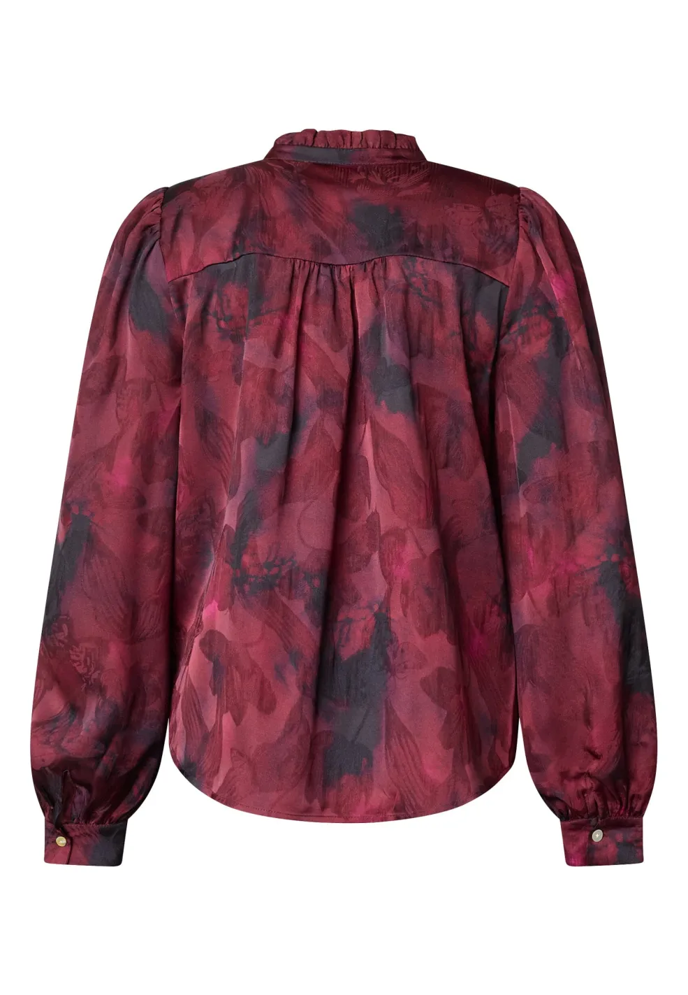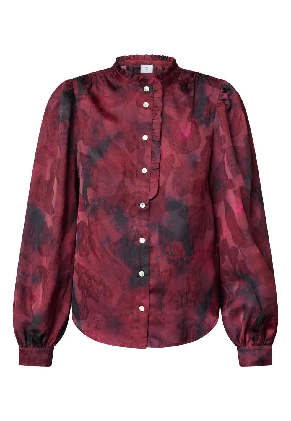 Bluse fra Sisters Point i bordeaux med et sløret blomsterprint. Blusen har en høj hals med flæser og knaplukning foran med hvide knapper.