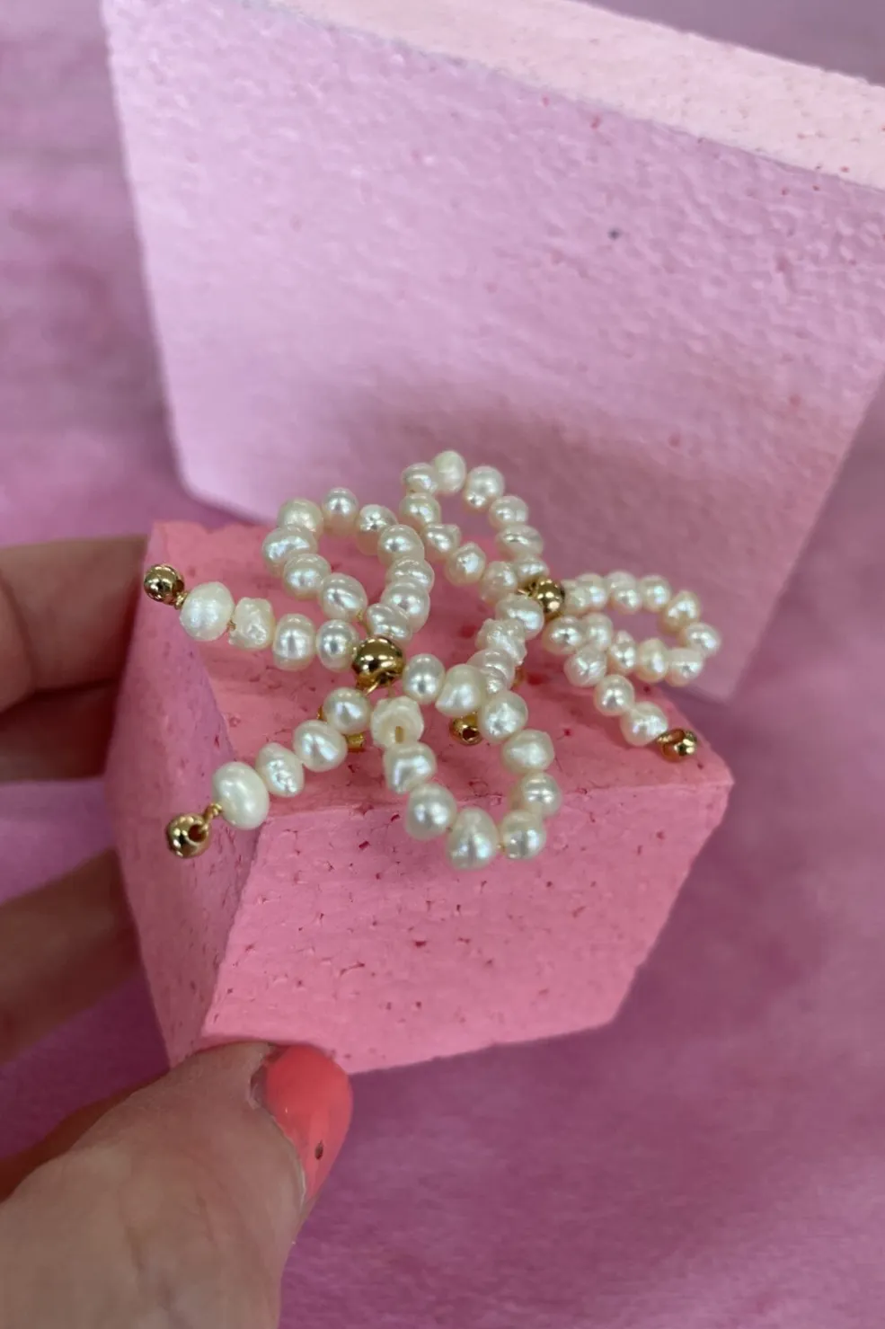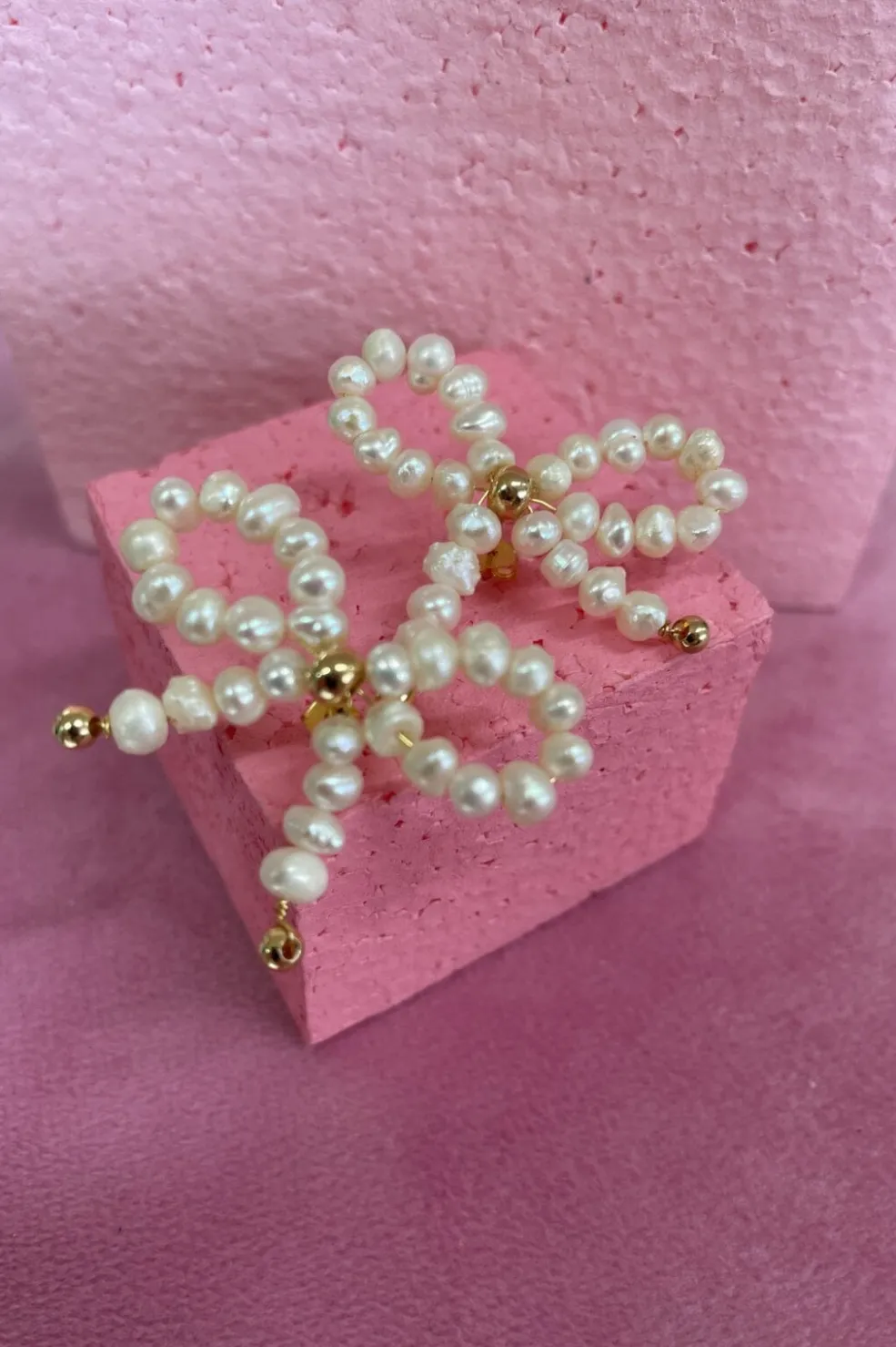 Forgyldte ørestik fra Mellow Moon med sløjfeformet design. De små perler danner en fin sløjfe med en guldperle i midten. Ørestikkene har en cream-hvid farve.