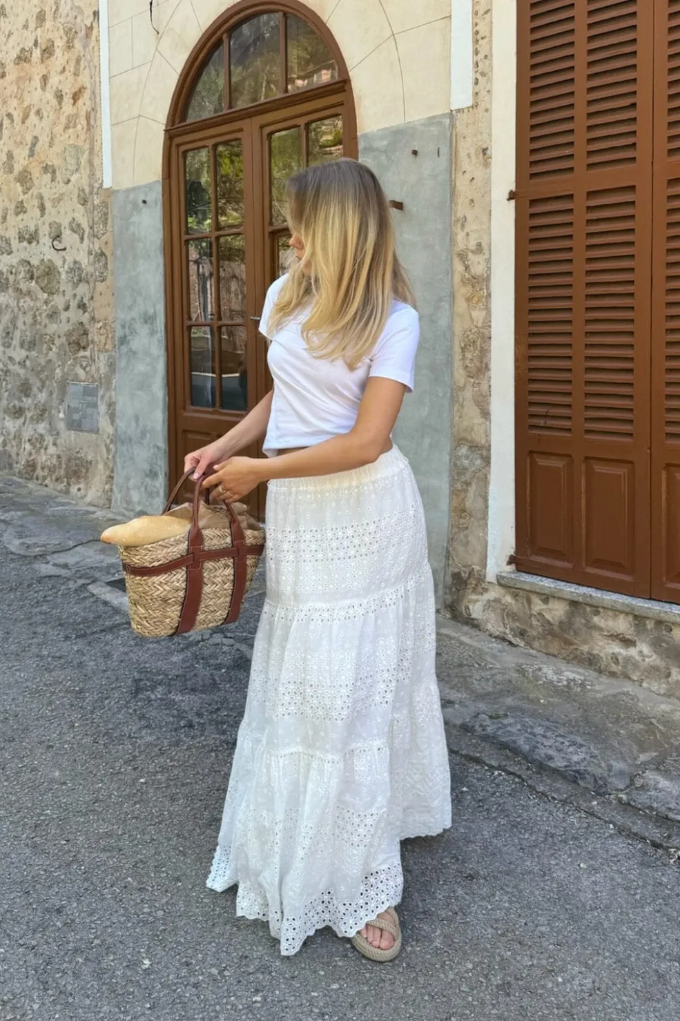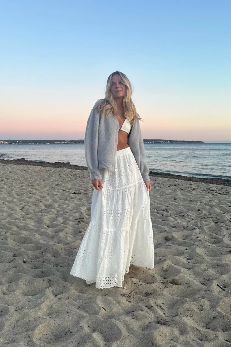Hvid blonde maxi nederdel med en elastik i taljen. Den har to lag stof.