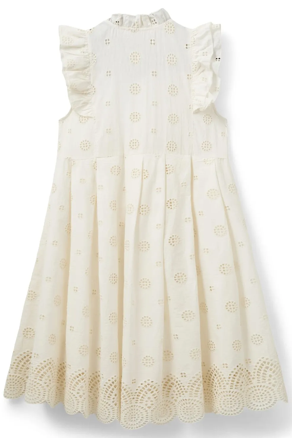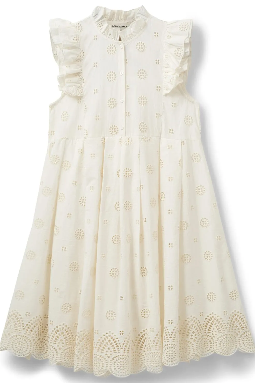 Off-white kjole fra Sofie Schnoor med polkaprikker og blondeudskæringer. Kjolen har høj hals og går til knæene med fine flæsedetaljer langs ærmekanten.