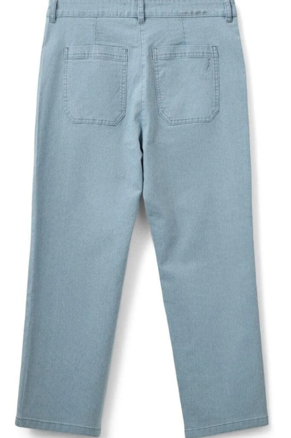 Stribede bukser fra Sofie Schnoor i lyseblå. Bukserne har broderidetaljer og går til anklen. Lukningen består af både lynlås og knapper.