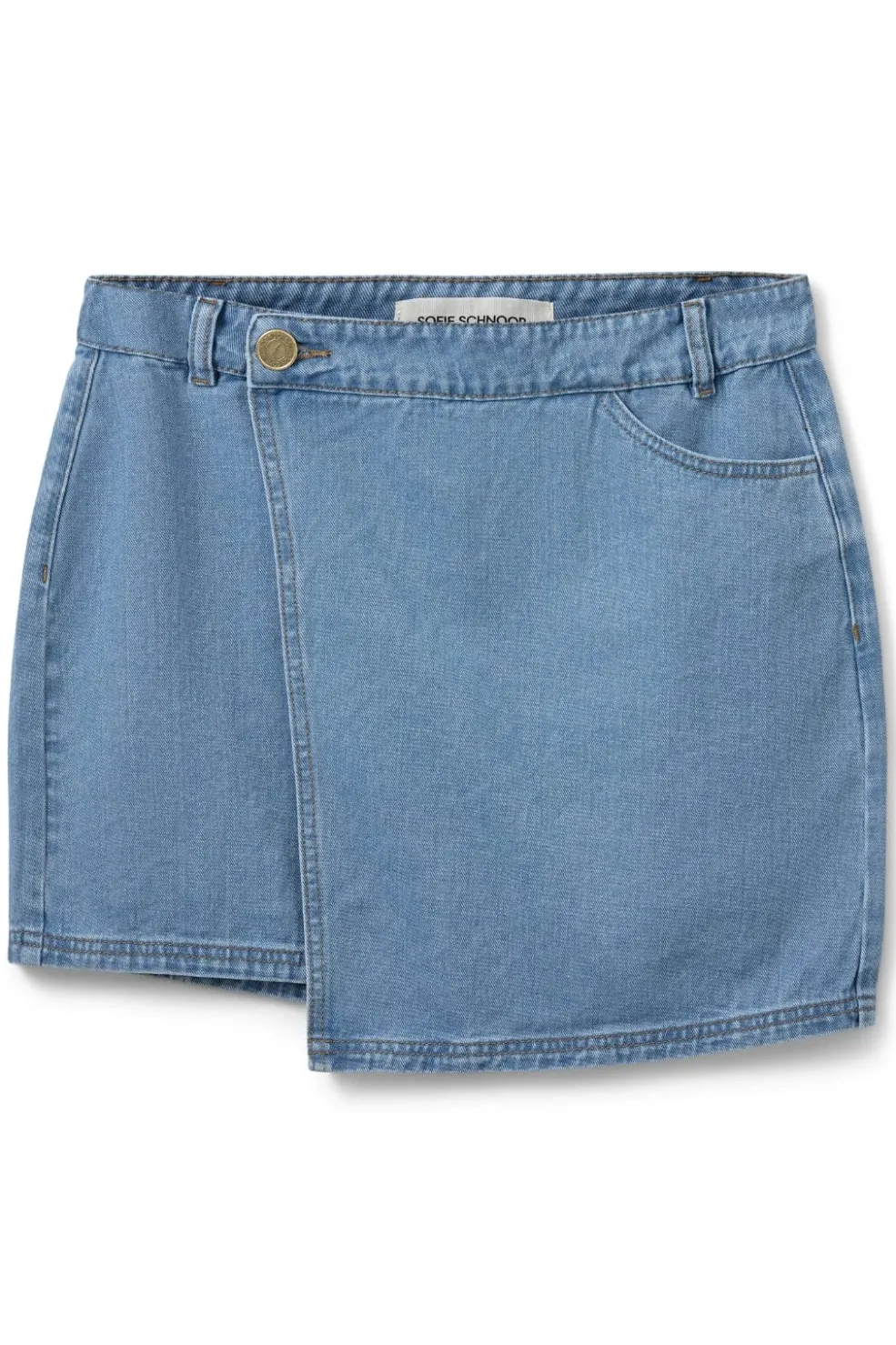 Denimnederdel i klassisk blå med asymmetrisk design. Den har dekorative syninger og knapper som lukning, der giver et maritimt præg. Nederdelen har en regulær taljehøjde.
