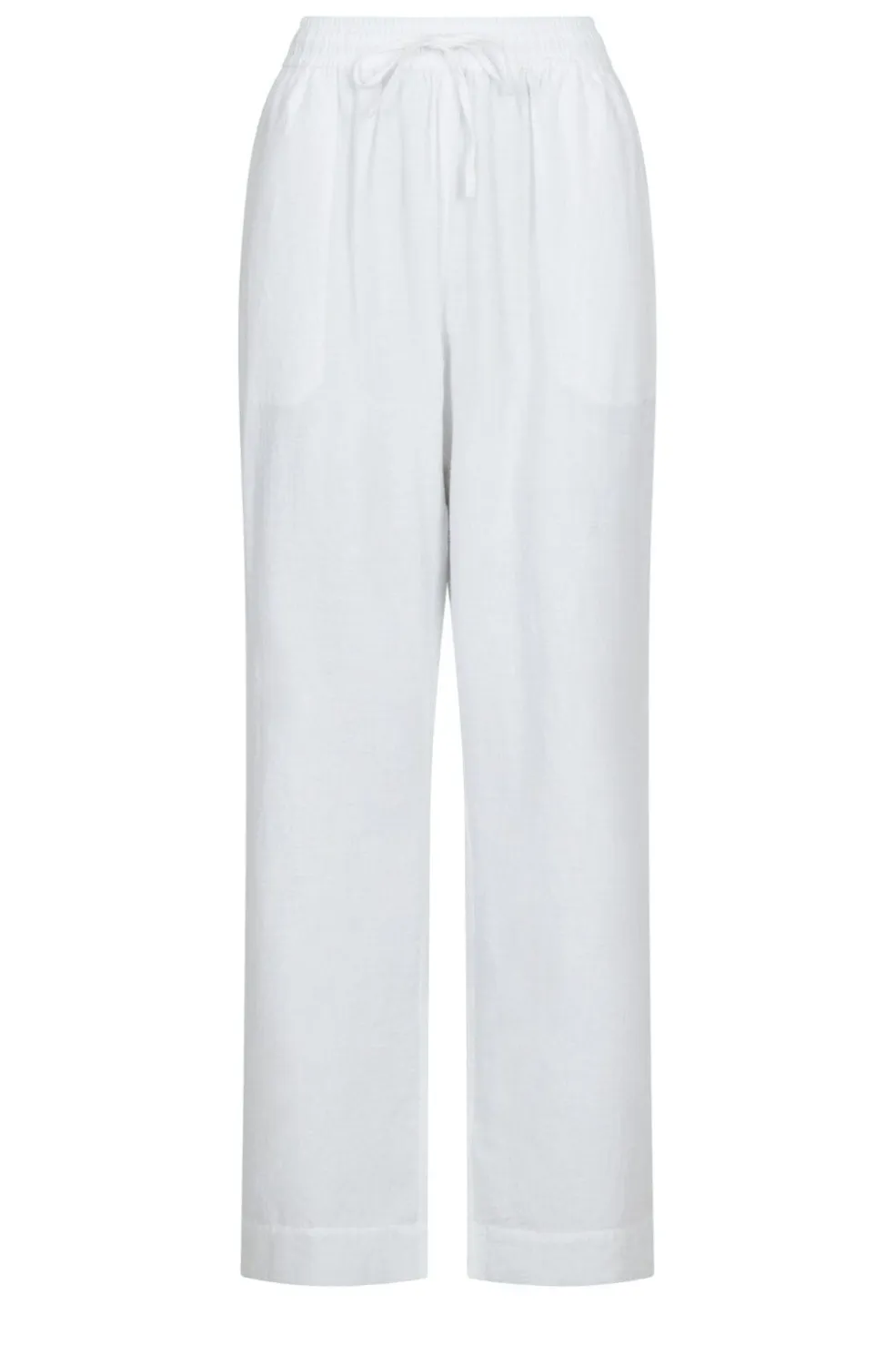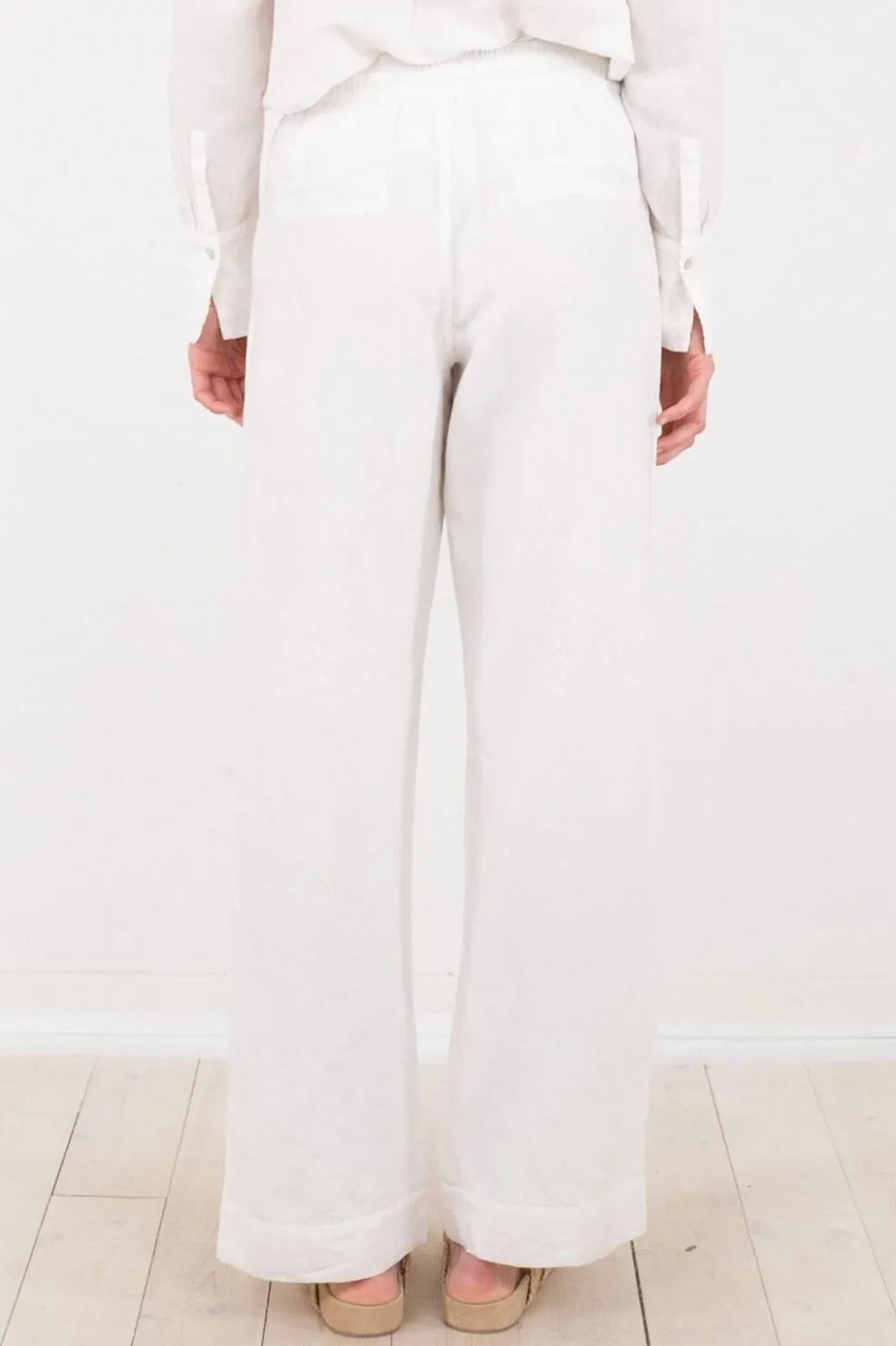 Hvide hørbukser fra Neo Noir med løs pasform og ankellængde. Bukserne har brede ben og en behagelig talje med elastik og bindebånd.