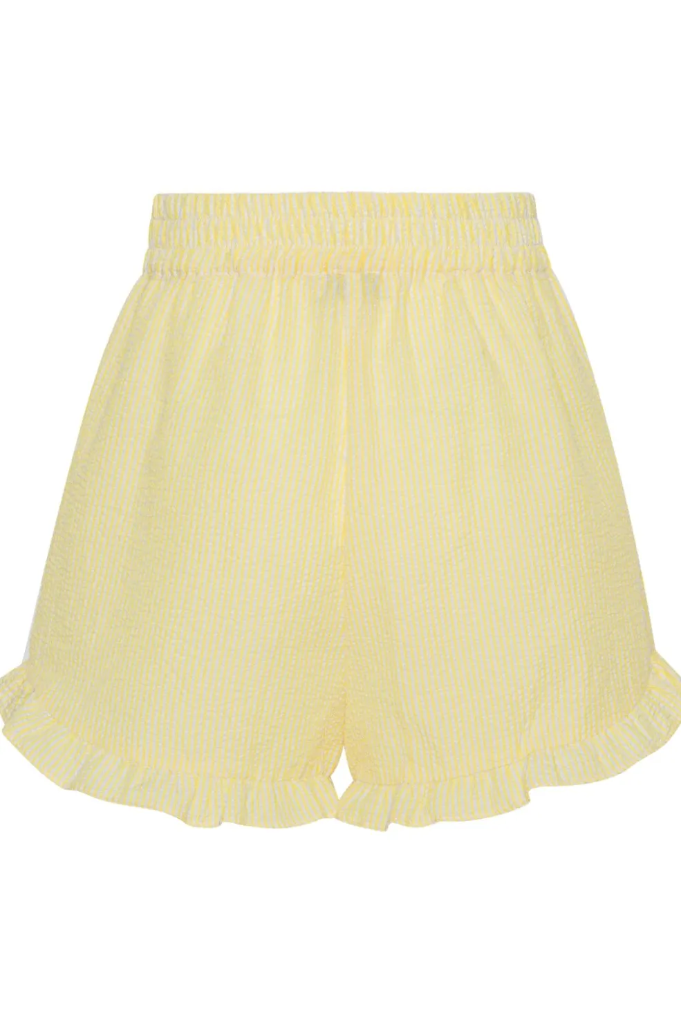 Gul- og hvidstribede shorts fra A-View i let crepemateriale. Shortsene har en løs pasform med flæsekant forneden og elastik i taljen.