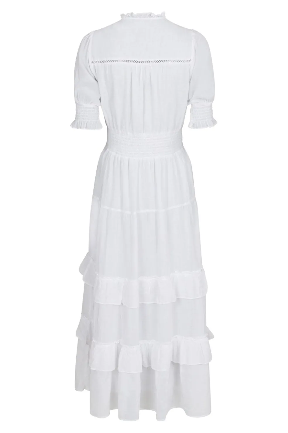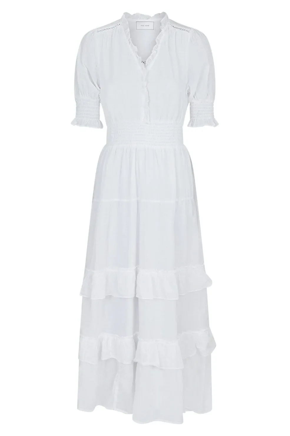 Hvid kjole fra Neo Noir i blød bomuldsvoile. Kjolen har et lagdelt design med flæser og en smockdetalje i taljen, der giver en fin silhuet.