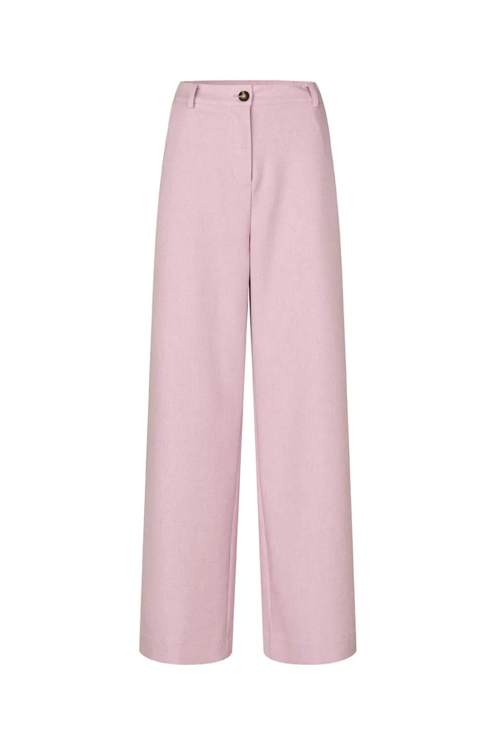 Lyserøde bukser fra Modström i melange. Bukserne har en høj talje med knap- og lynlåslukning samt brede ben i gulvlængde. Stoffet har en let meleret overflade.