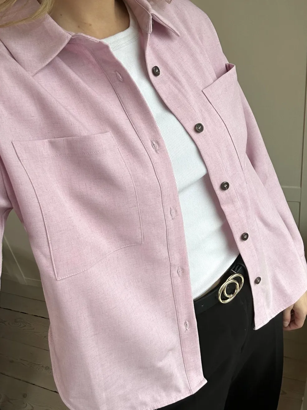 Skjorte fra Modström i pink melange med klassisk krave og knaplukning. Den løse pasform og de lange ærmer giver god bevægelsesfrihed, mens de to brystlommer tilføjer et praktisk element.