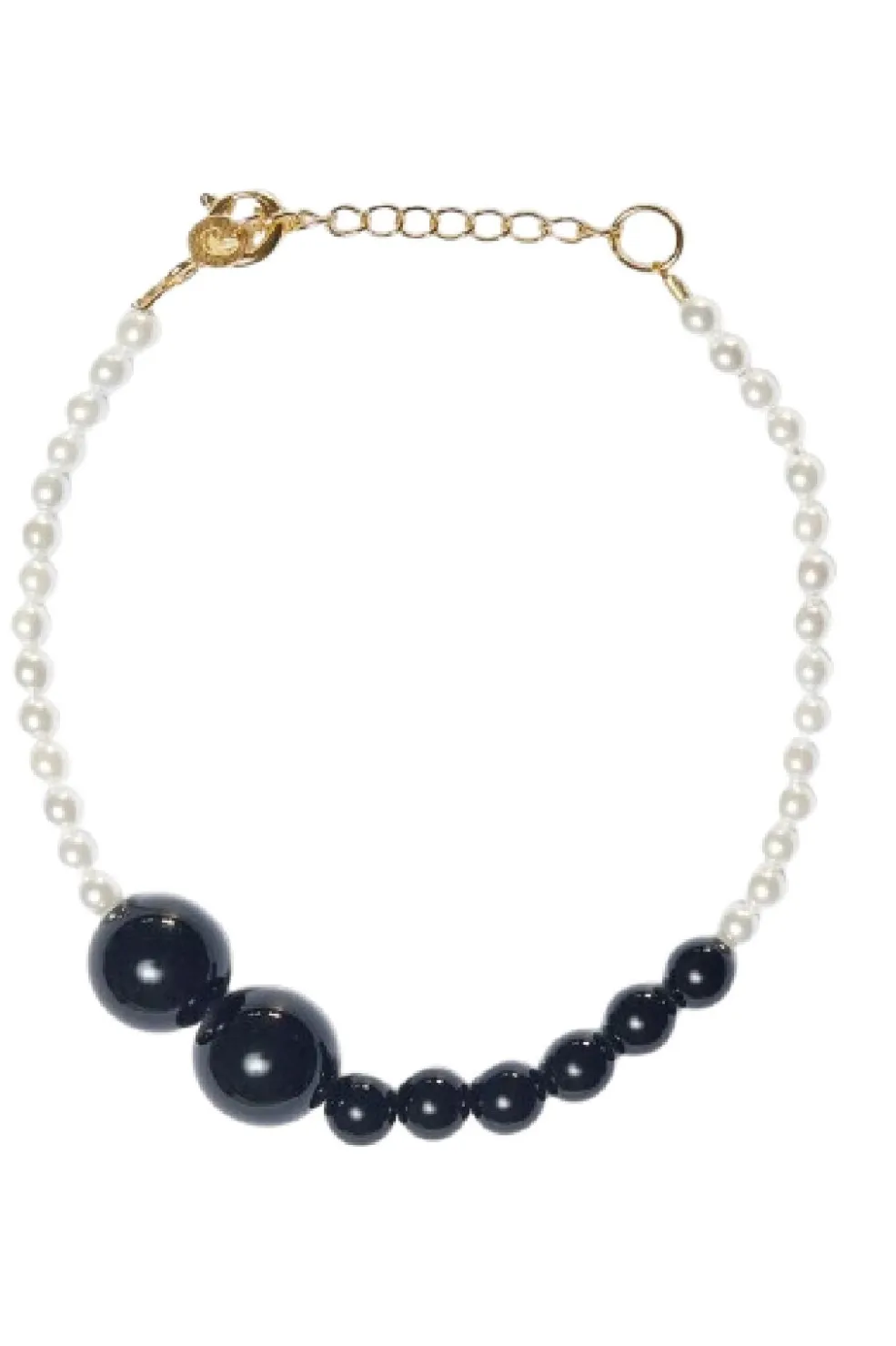 Forgyldt armbånd fra Sorelle Jewellery med sort agat og hvide ferskvandsperler. Håndlavet på værksted i Danmark med lås og forlængerkæde.