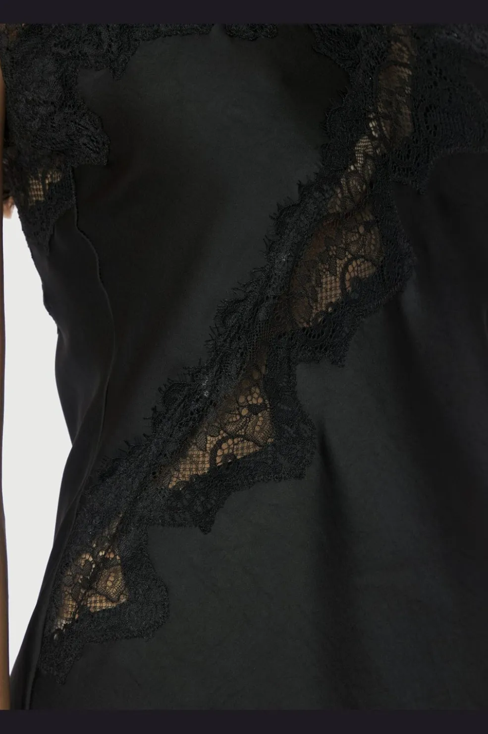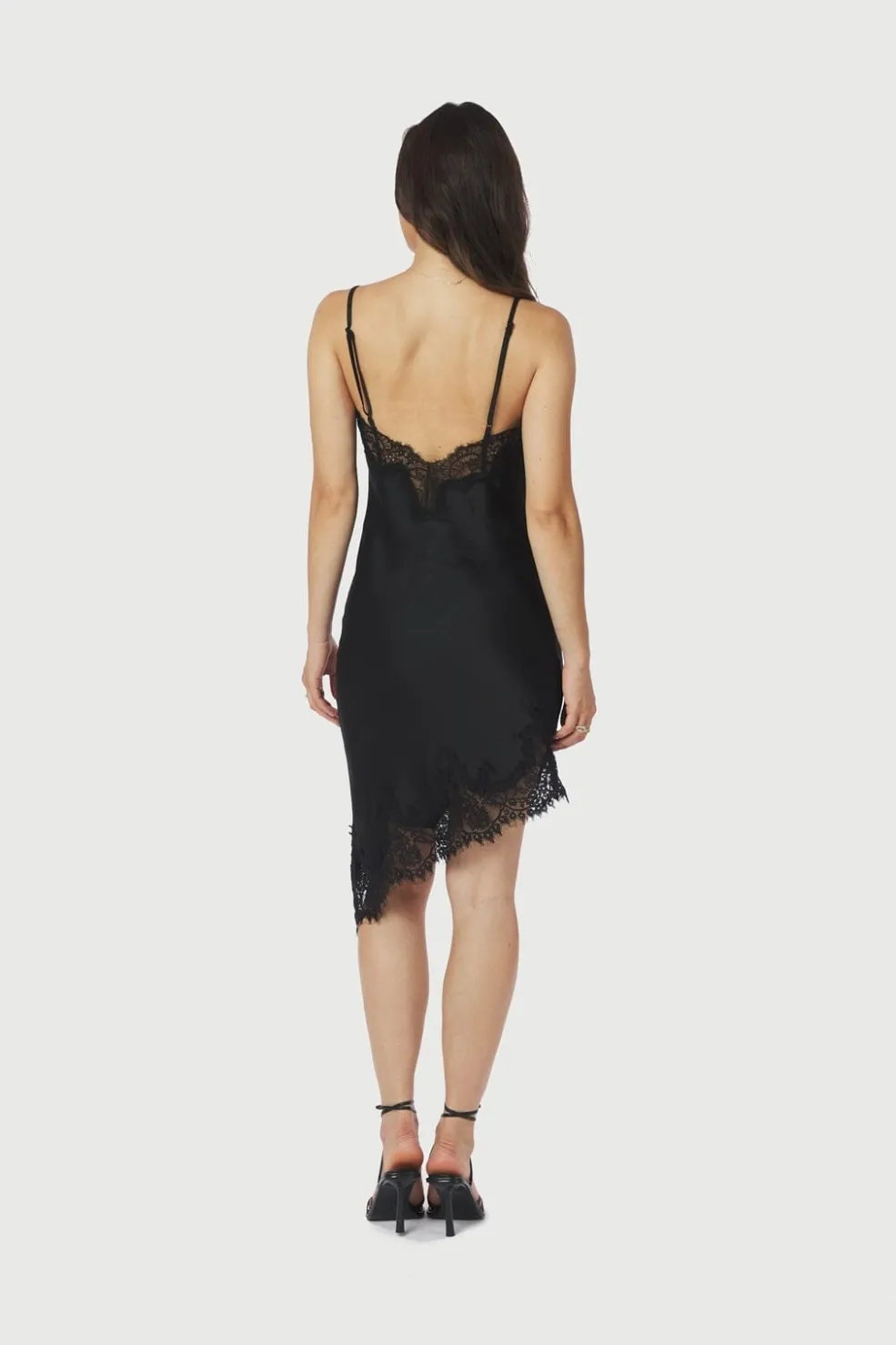 Sort blondekjole fra Neo Noir med asymmetrisk kant. Kjolen har tynde stropper og blondedetaljer ved V-udskæringen samt langs den nederste kant.