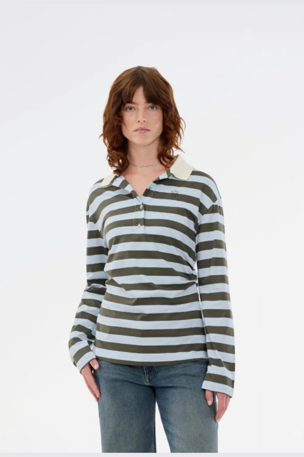 Langærmet polo fra Modström i økologisk bomuld. Designet med vandrette striber i lyseblå og mørkegrønne nuancer samt en hvid polokrave med knaplukning.