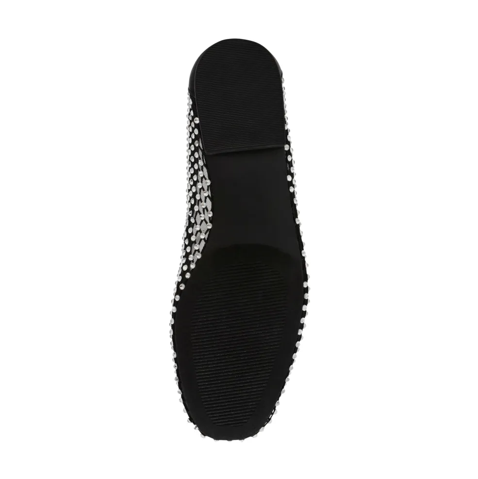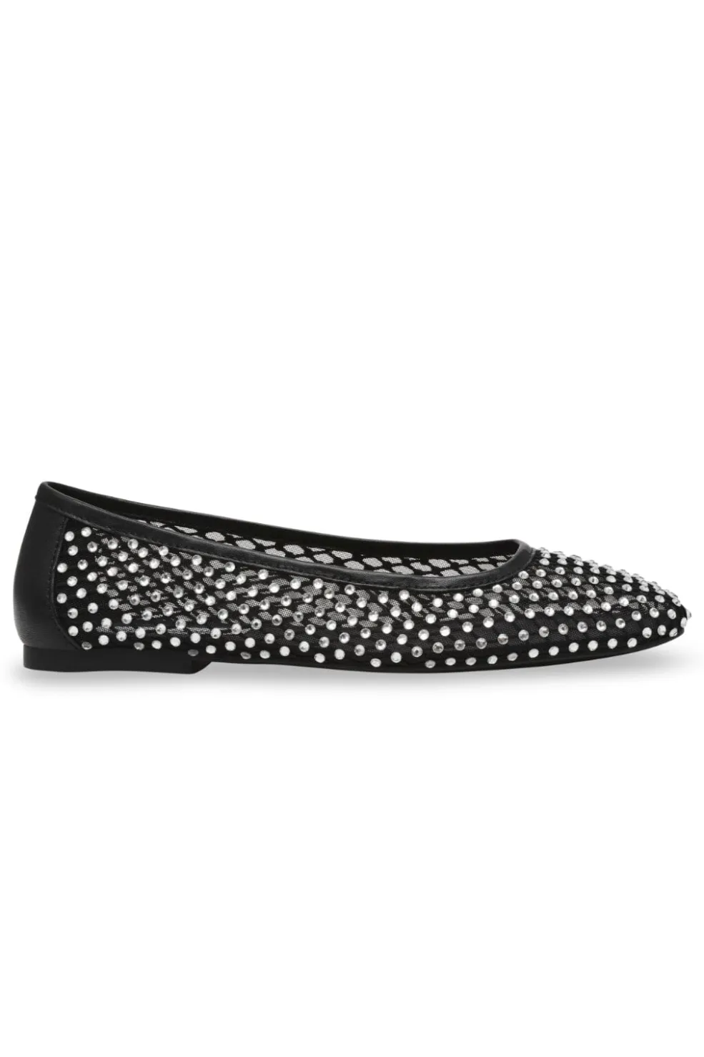 Sorte ballerinaer fra Steve Madden i stof-polyuretan mesh med sølvfarvede perledetaljer. Den flade hæl og runde tå giver skoen et klassisk udtryk.
