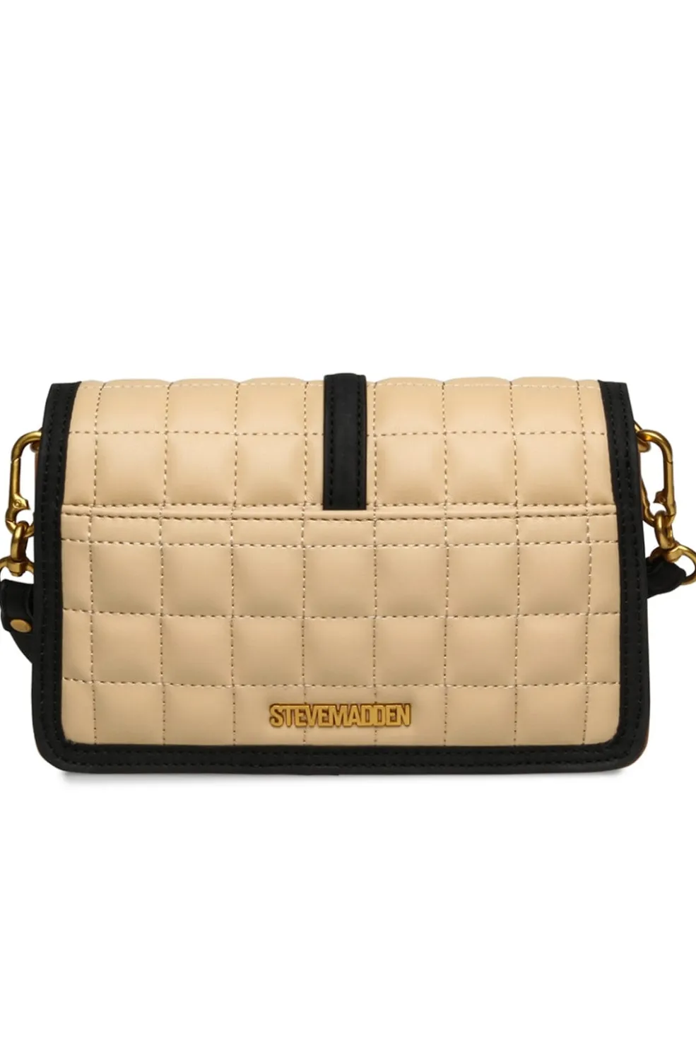 Crossbody-taske fra Steve Madden med kviltet design i tan og sort. Tasken har sorte kanter og guldfarvet hardware, der fremhæver det todelte farvespil.