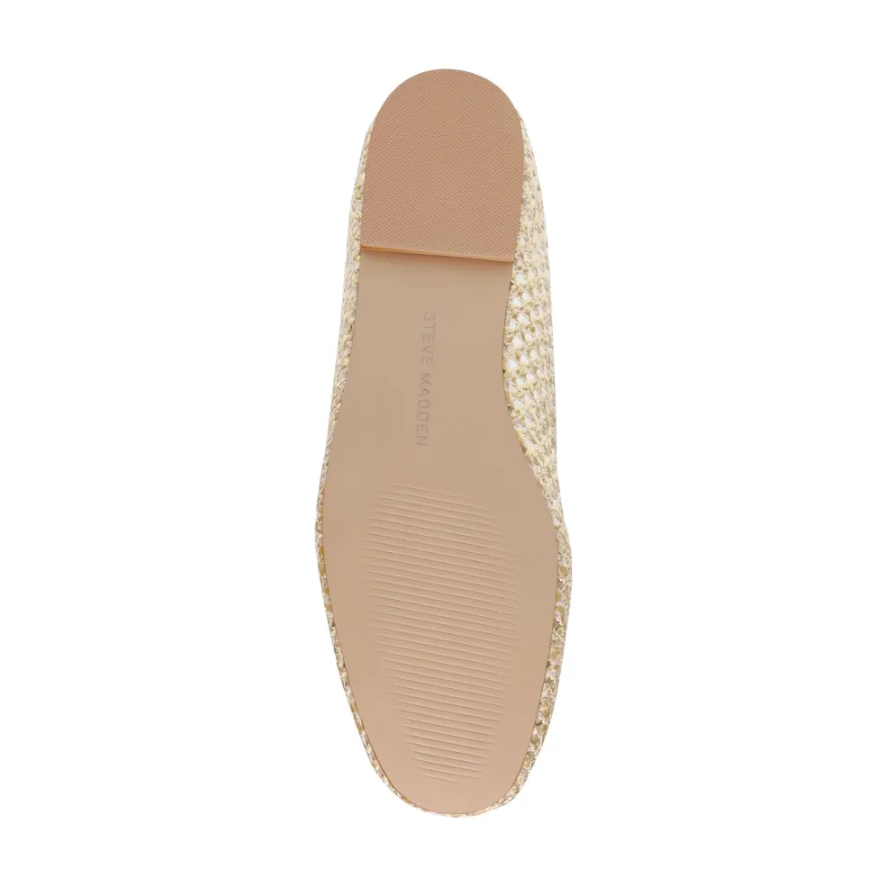 Ballerina fra Steve Madden med flettet design i guldfarvet raffia. Skoen har en rund tå og elastisk lukning.