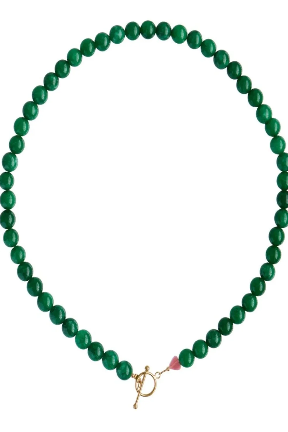 Halskæde fra Stine A med runde grønne perler af jade og en guldfarvet toggle-lås med en lyserød detalje ved låsen.