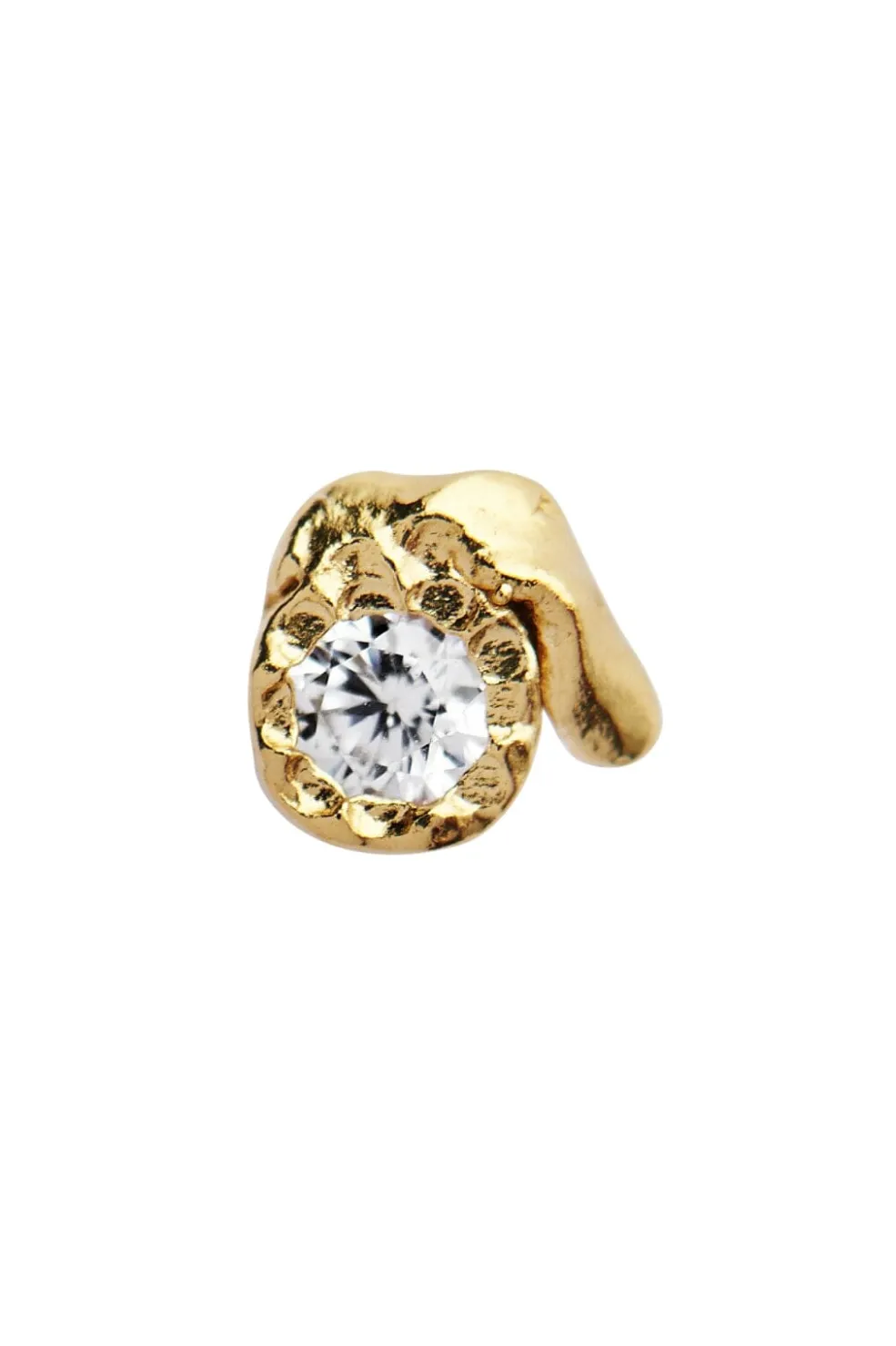 Gylden ørering fra Stine A med en snoet overflade og bakket design. En klar ædelsten sidder i midten af øreringen og giver smykket et diskret pift.