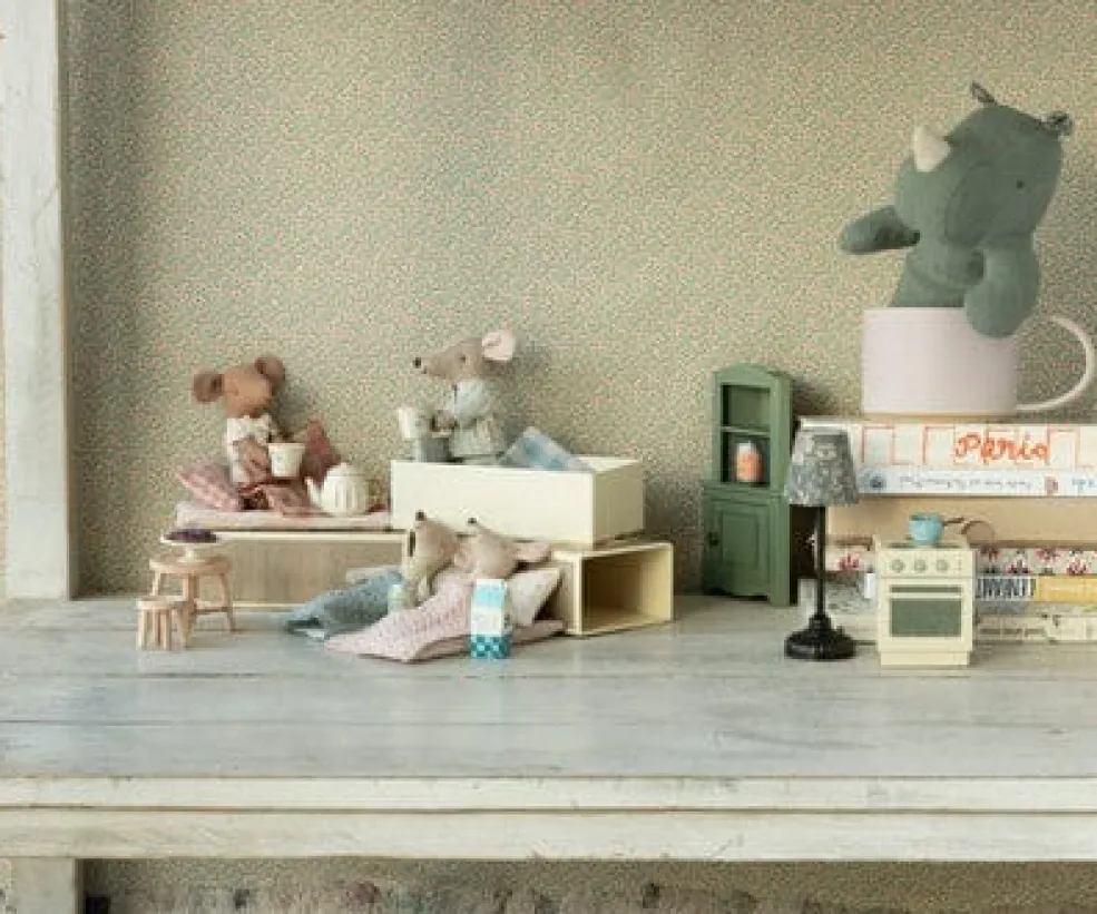 En klassisk Maileg-vare. Denne mus er klar til timevis af leg og sover godt i tændstikæsken. Tøjet og sengetøjet kommer i unikke mønstre og smukke farver.