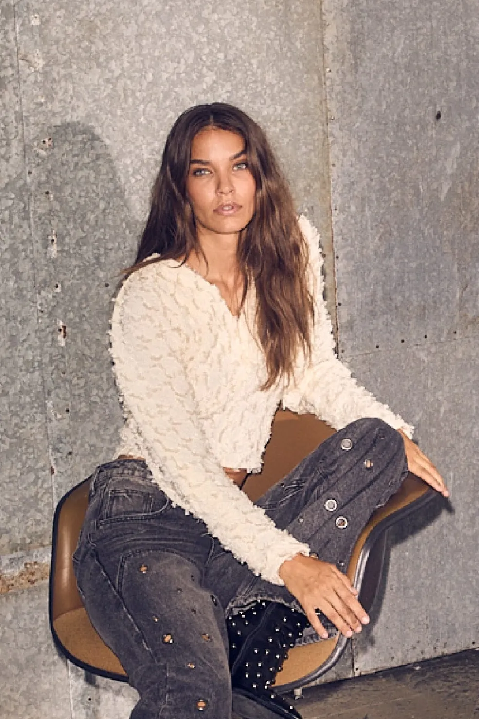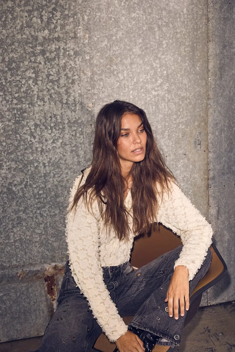 Off-white bluse fra Haute L’Amitié med V-udskæring og lange ærmer. Blusen har flæser og en almindelig pasform.