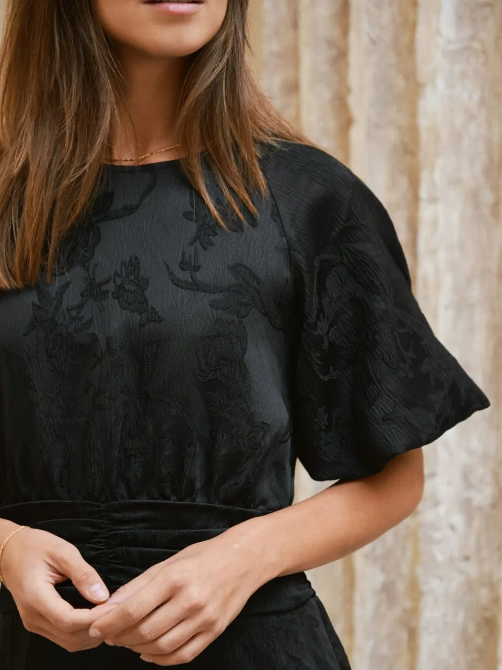 Sort jacquardkjole fra Neo Noir med blomstermønster. Kjolen har 3/4-ærmer med elastik, bånd i taljen og går til knæet. Flæsekanter og pyntesyninger giver kjolen et feminint udtryk.