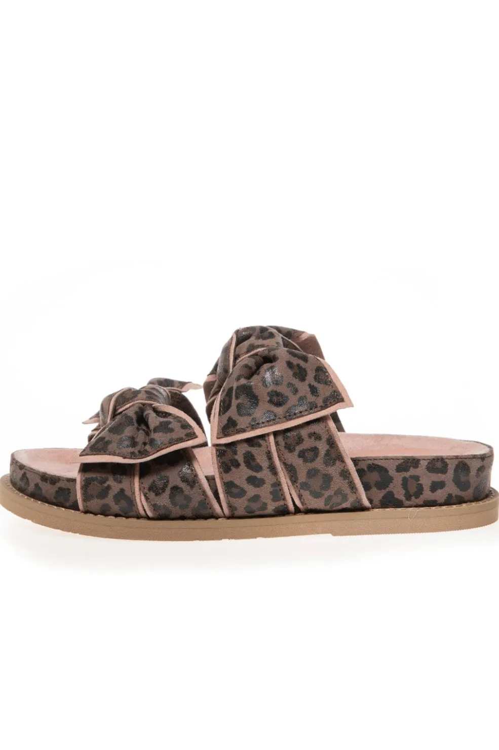 Sandaler fra Copenhagen Shoes i ruskind med leopardprint i grå og fersken nuancer. Designet har store sløjfer på stropperne og en lav sål.