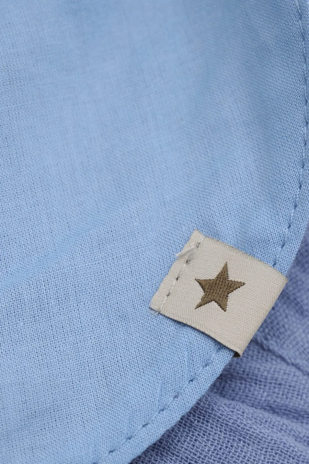 Lyseblå sommerhat fra Huttelihut med bred skygge og nakkebeskyttelse. Den bløde muslinhat har påsyede ører på toppen og beskytter mod solen under udendørs leg.
