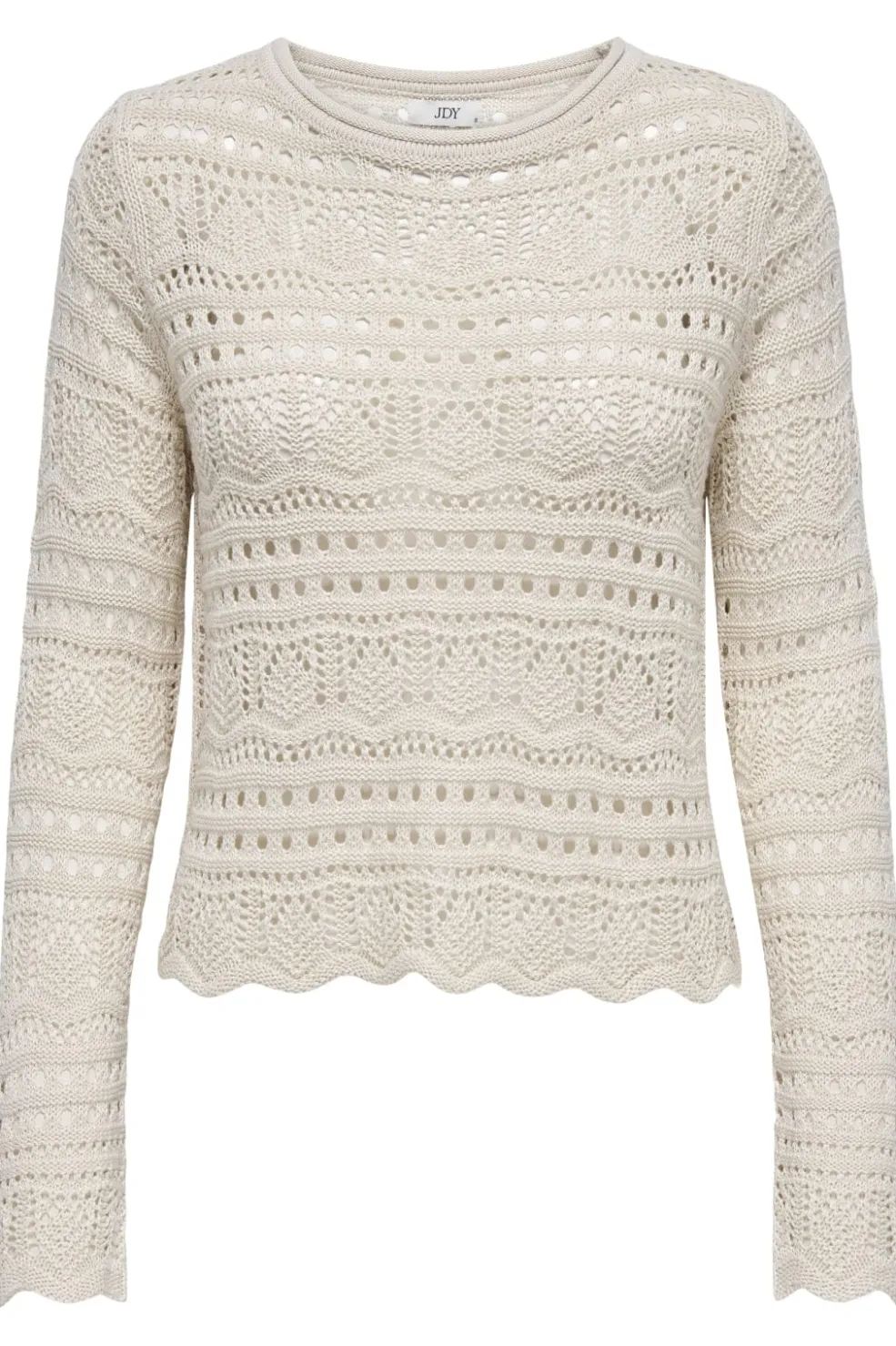 Striktrøje fra JDY i en lys tapiocafarve. Trøjen har strukturstrik og muslingedetaljer gennem hele designet, der skaber et fint mønster i strikken.