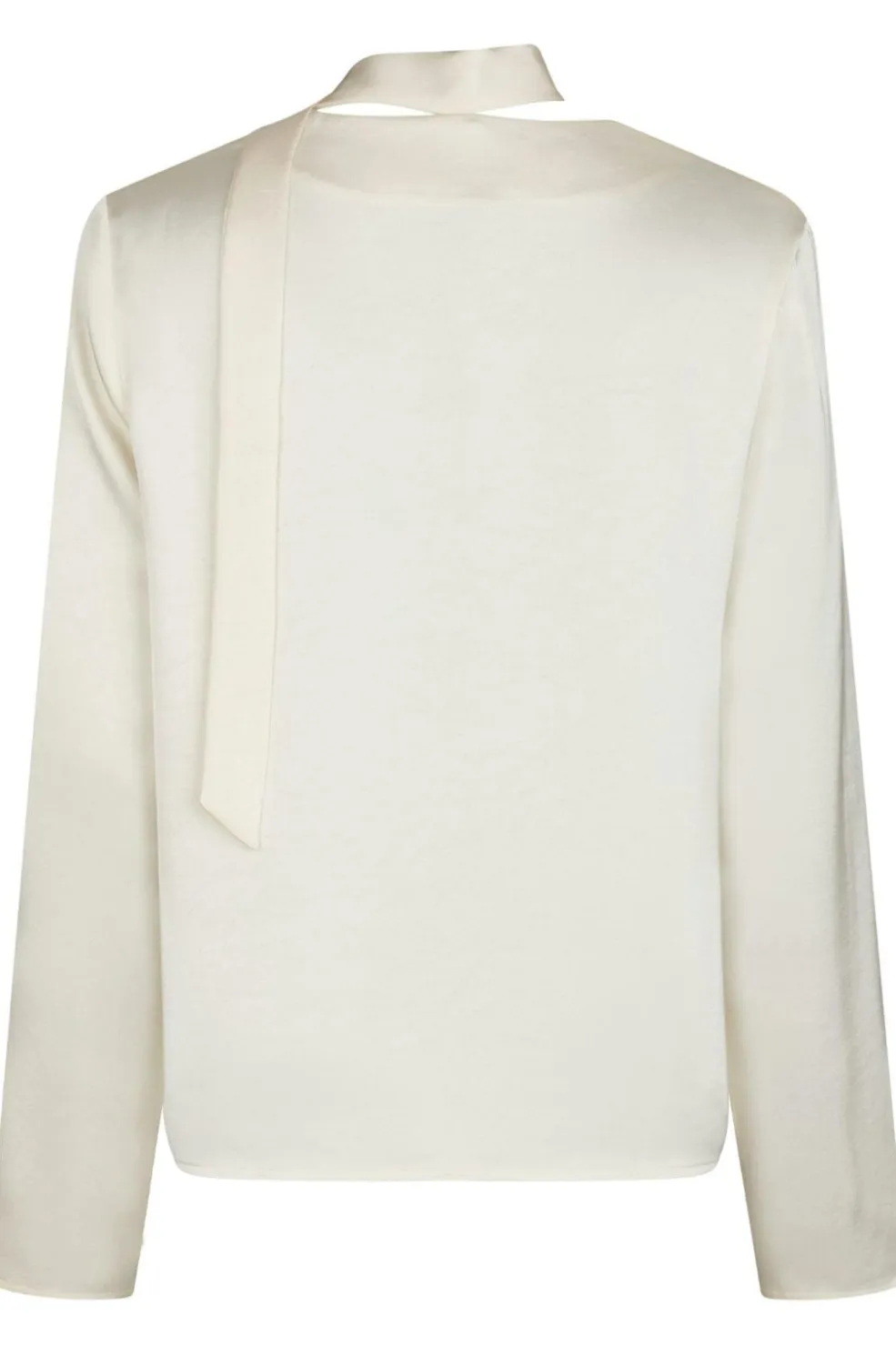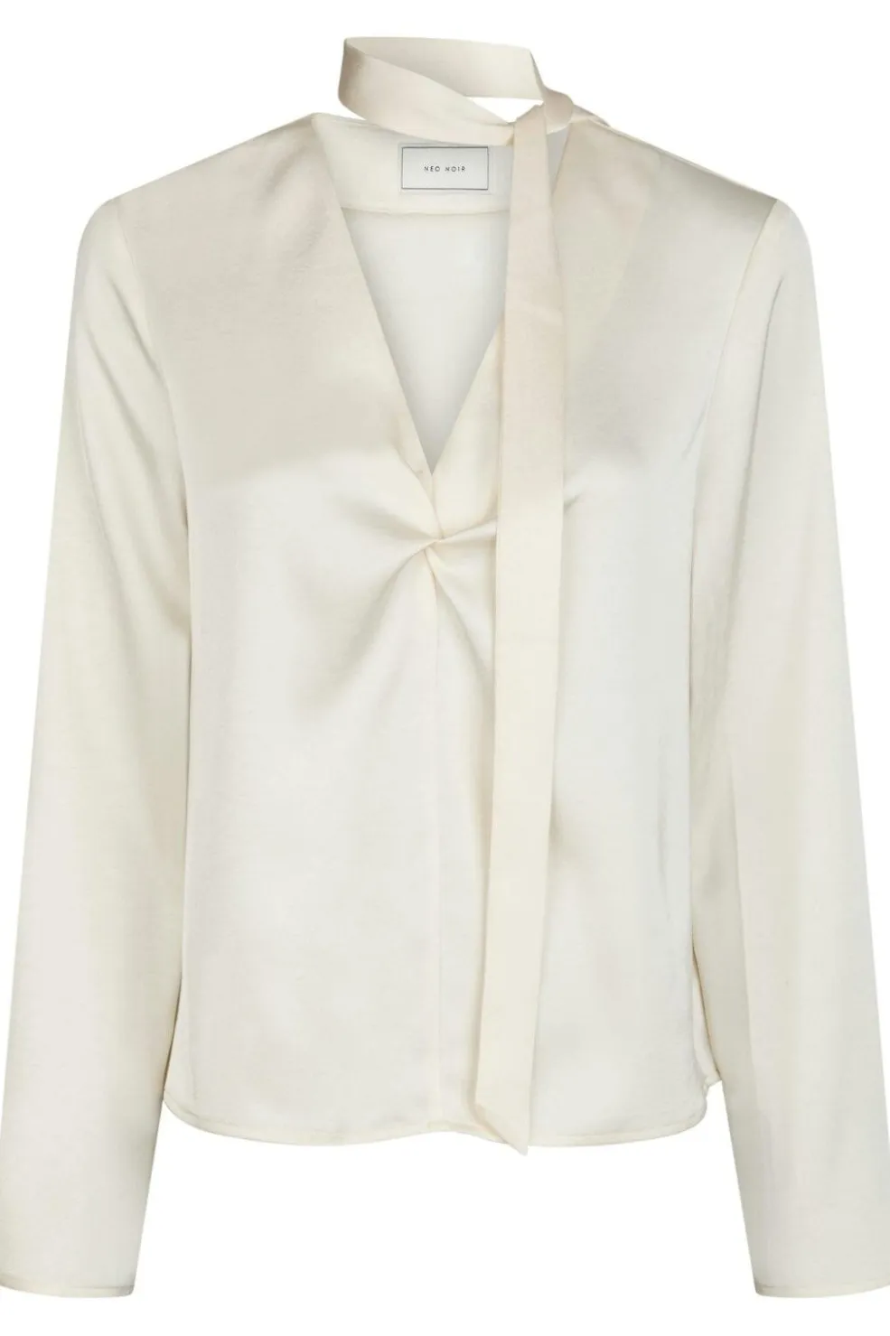 Perlefarvet bluse fra Neo Noir i kraftig satin. Blusen har en dyb V-halsudskæring, lange ærmer og et aftageligt tørklæde i samme materiale.