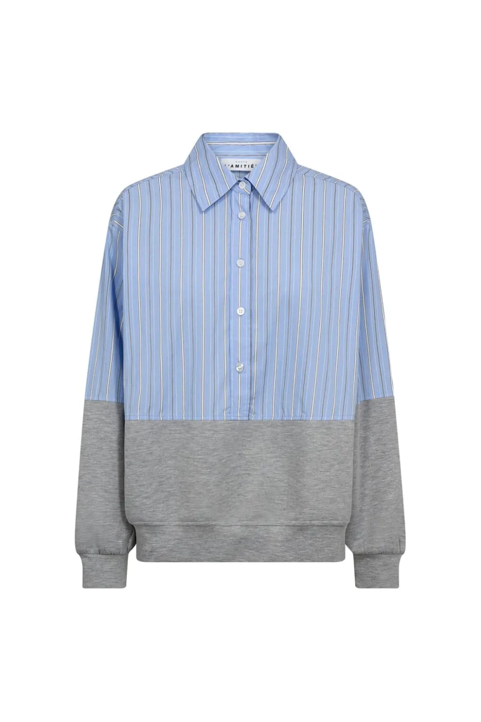 Skjorte fra Haute L’Amitié med en kombination af stribet skjortestof øverst og sweatshirtstof nederst i grå melangé.