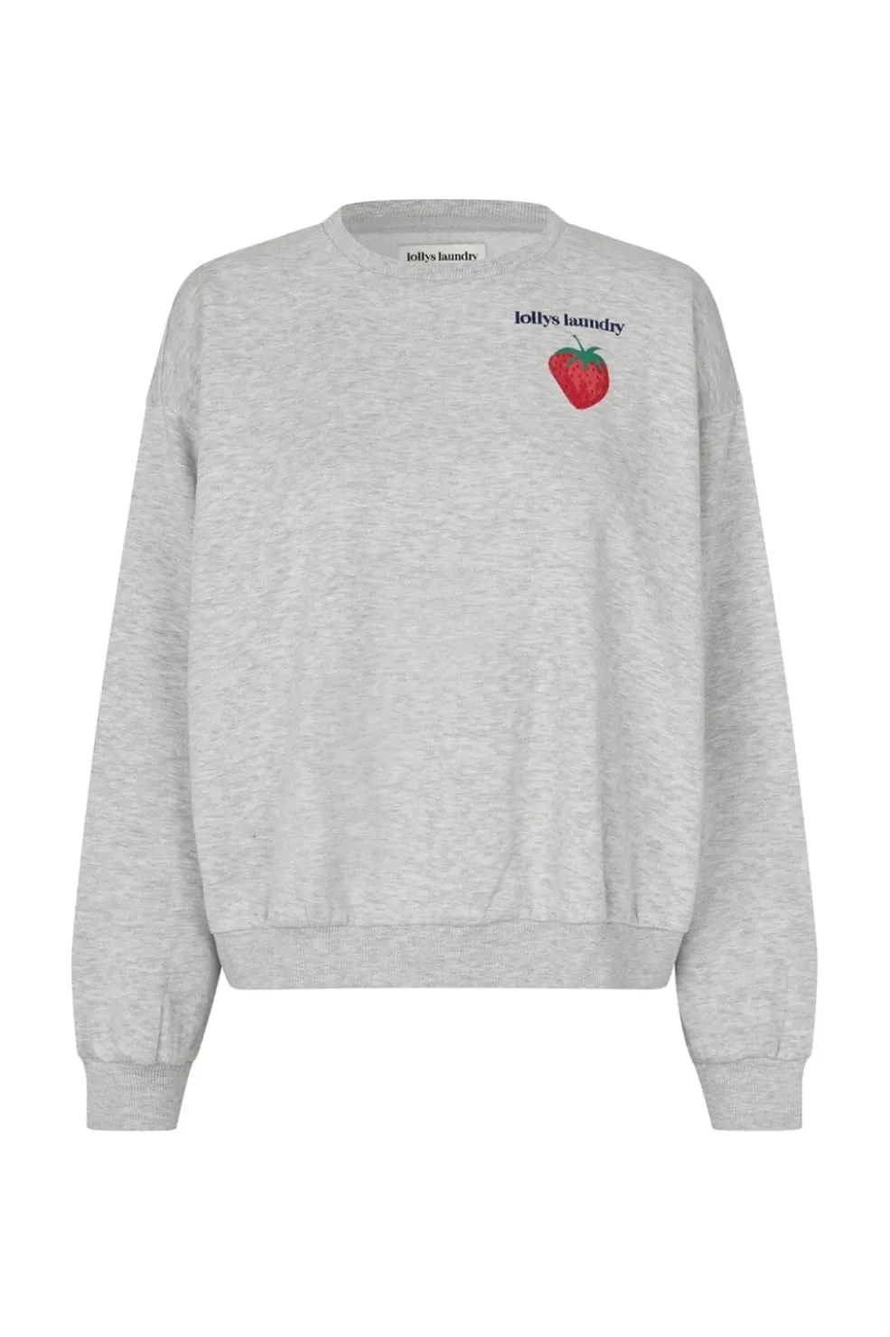 Sweatshirt fra Lollys Laundry i lysegrå meleret stof. Sweatshirten har jordbærgrafik på for- og bagsiden med broderi og pailletter.