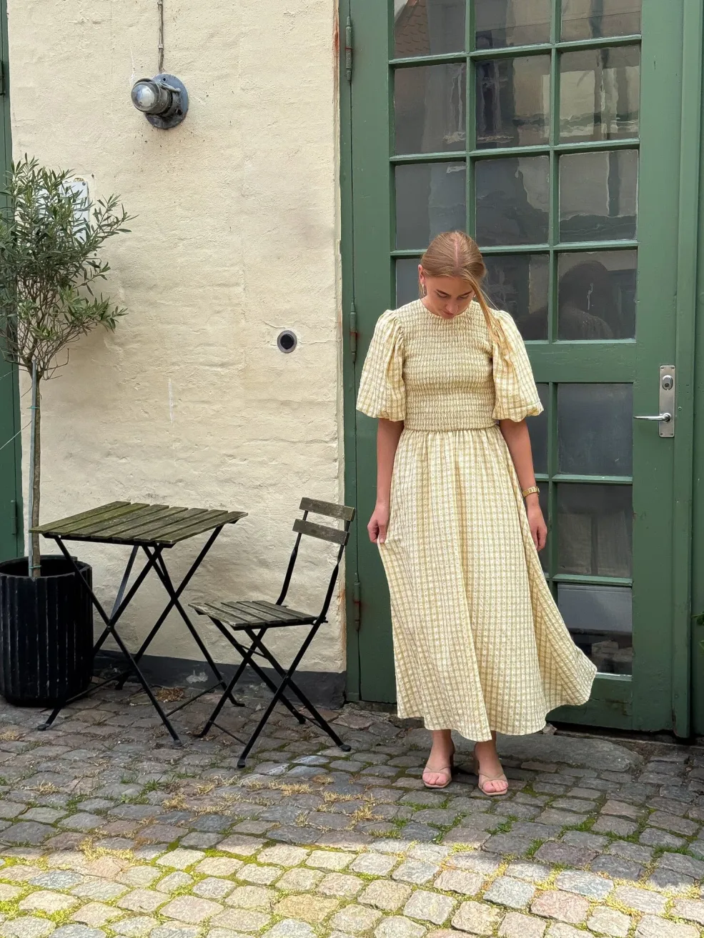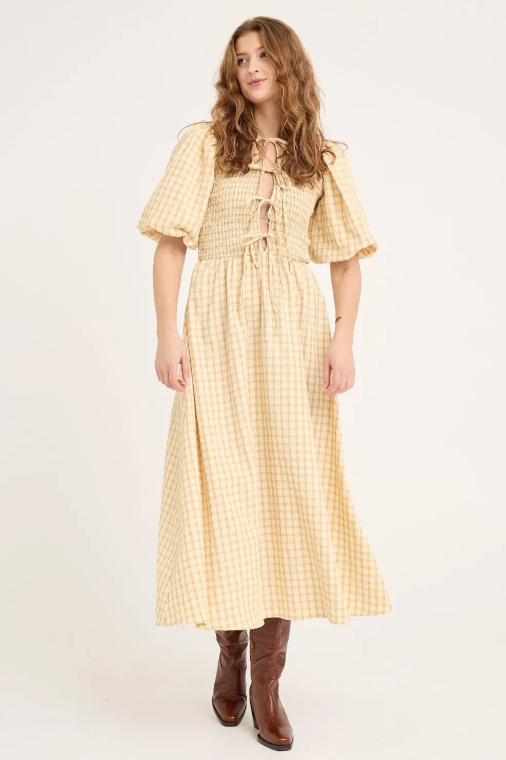 Lang kjole i lys gul med ternet mønster. Kjolen har smock-detaljer i livet og bindebånd på ryggen. De puffede ærmer og den lange længde giver kjolen et sommerligt udtryk.