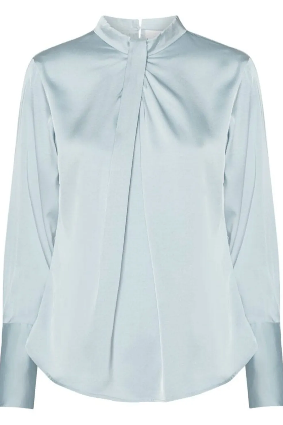 Lyseblå bluse fra Karmamia med høj hals og plissering foran. Knapper som lukning og lange ærmer med kontrastfarvede manchetter gør blusen velegnet til både kontoret og festlige anledninger.