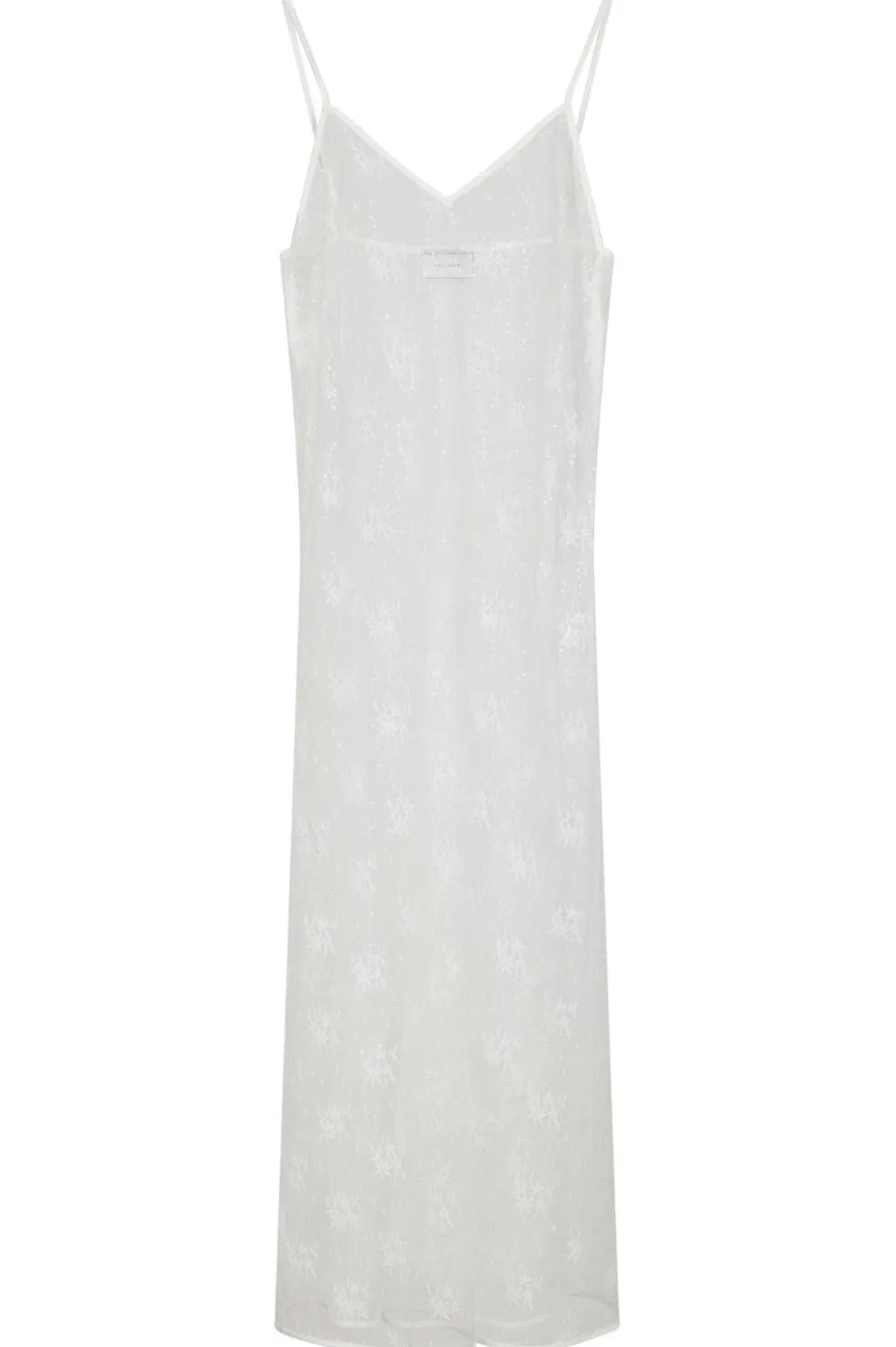 Hvid blondekjole fra Neo Noir med pailletter og gennemsigtigt stof. Kjolen har tynde stropper, V-udskæring og ankellængde. Blomstermønstret i blonden giver kjolen et romantisk præg.